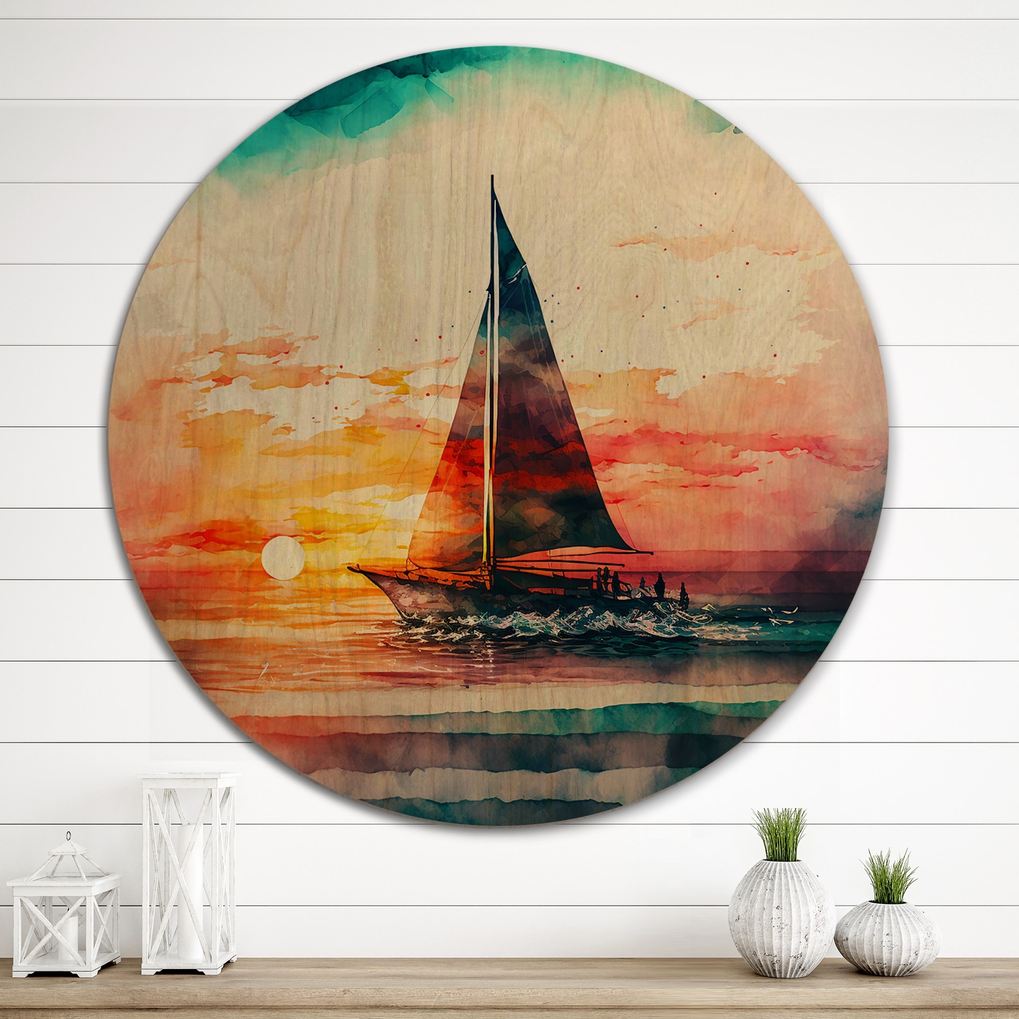 Designart "Sailboat On the Ocean Watercolor Sunset II" Coastal Boat Wood Wall Art - Natural Pine Wood