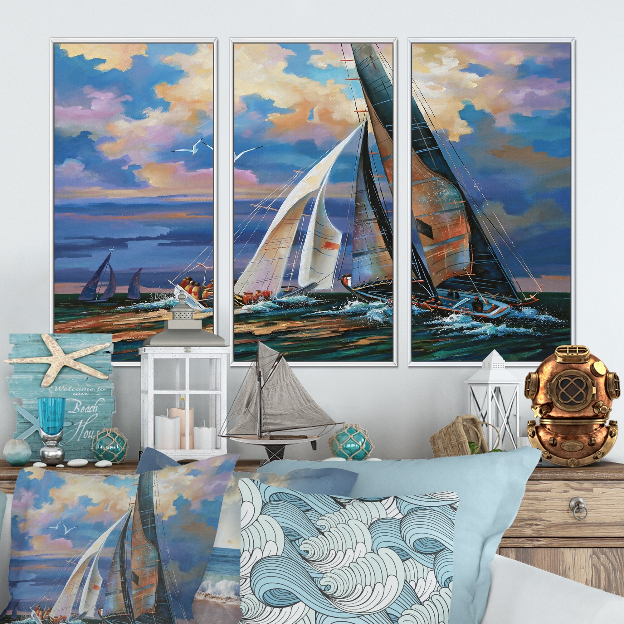 Designart "Regatta Sailboats Arriving At the Finish III" Nautical & Coastal Framed Art Prints Set of 3 - 4 Colors of Frames