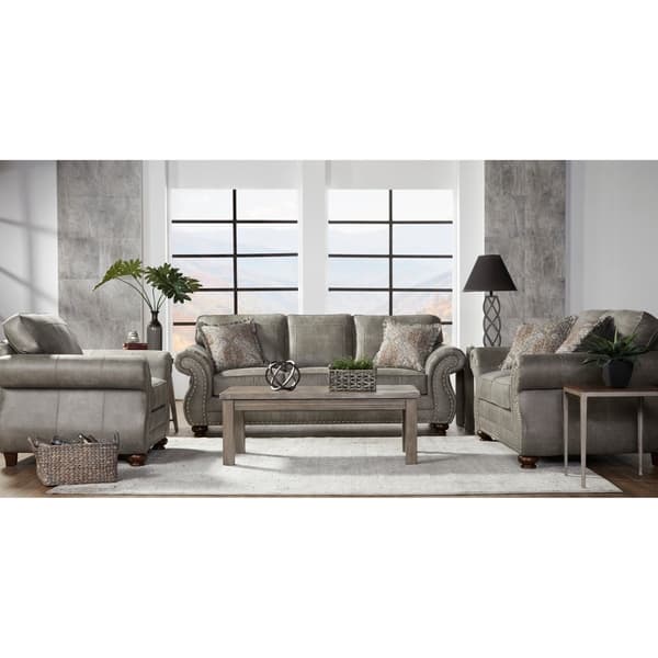Roundhill Furniture Leinster Faux Leather Upholstered Nailhead Sofa, Loveseat, and Chair Set in Stone Gray