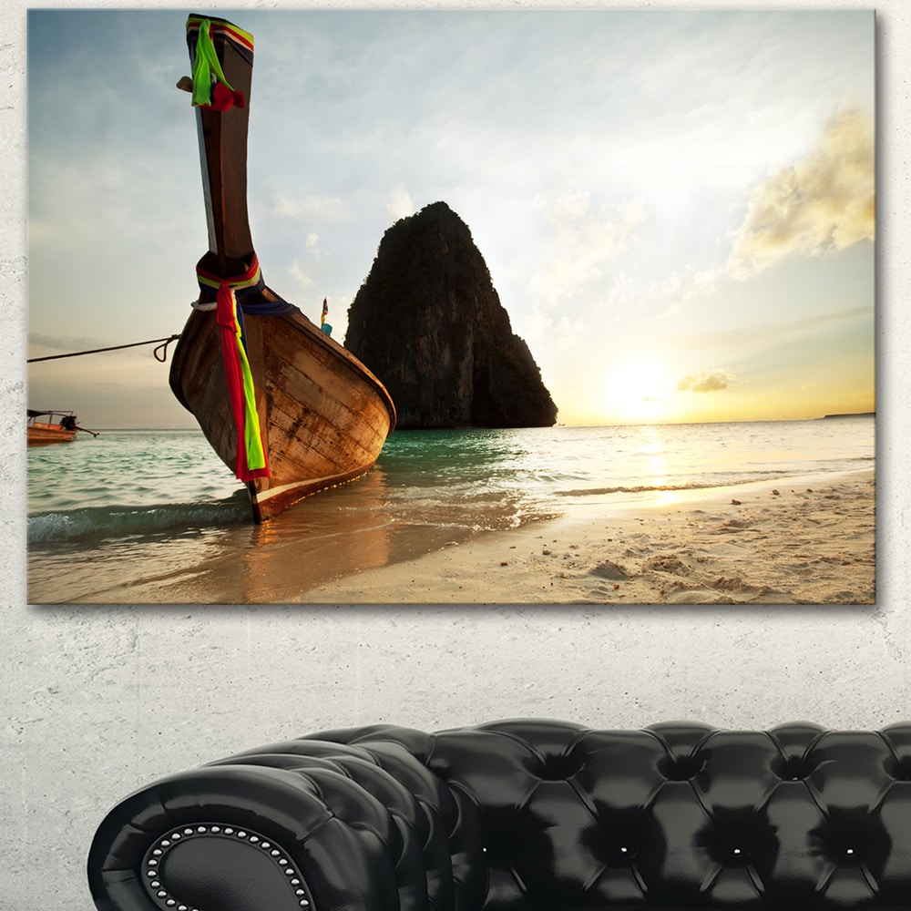 Designart "Brown Ship on the Seas Ii" Modern Landscape Beach Framed Canvas Art Print