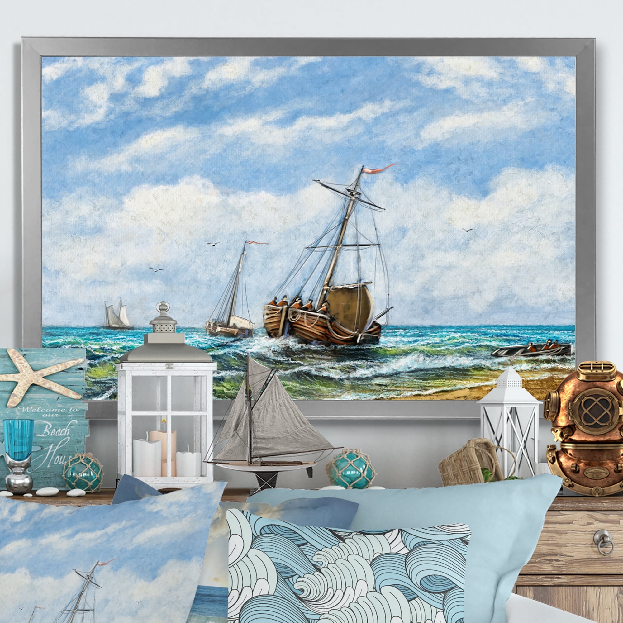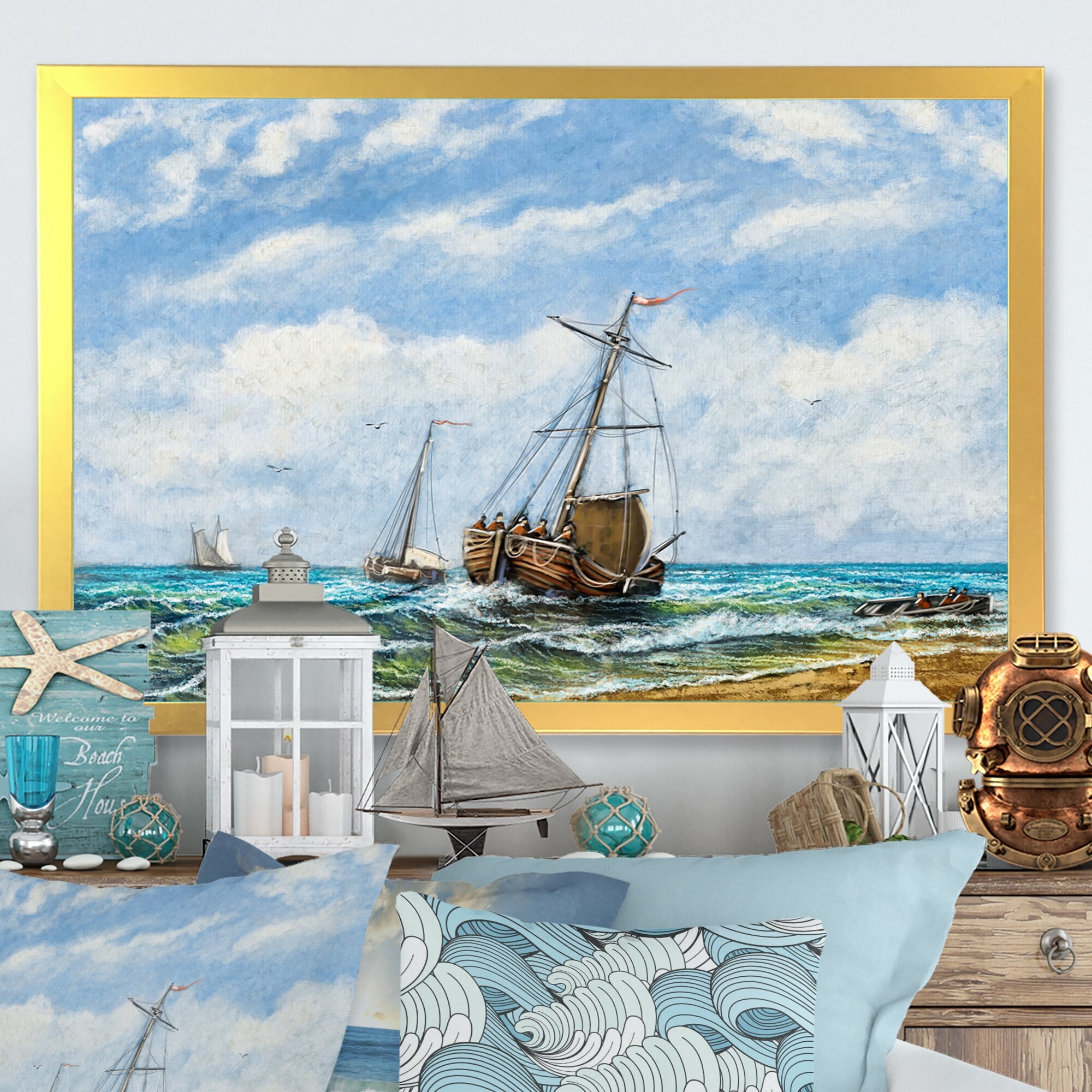 Designart "Impressionist Seascape With Little Ships I" Nautical & Coastal Framed Canvas Wall Art Print