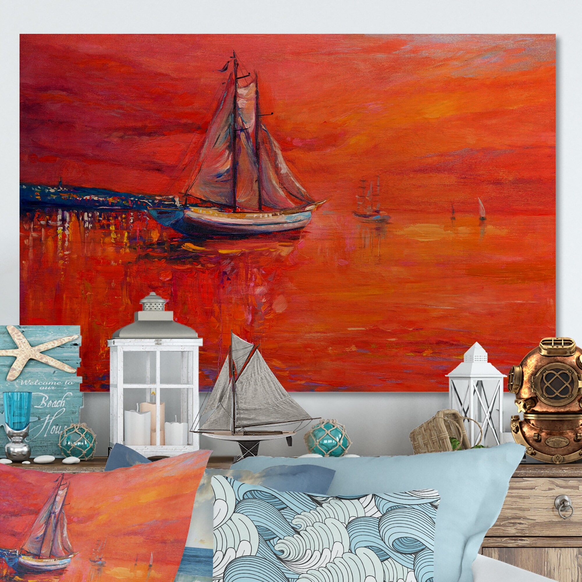 Designart 'Little Ship on Red Ocean' Nautical & Coastal Wood Wall Art - Natural Pine Wood