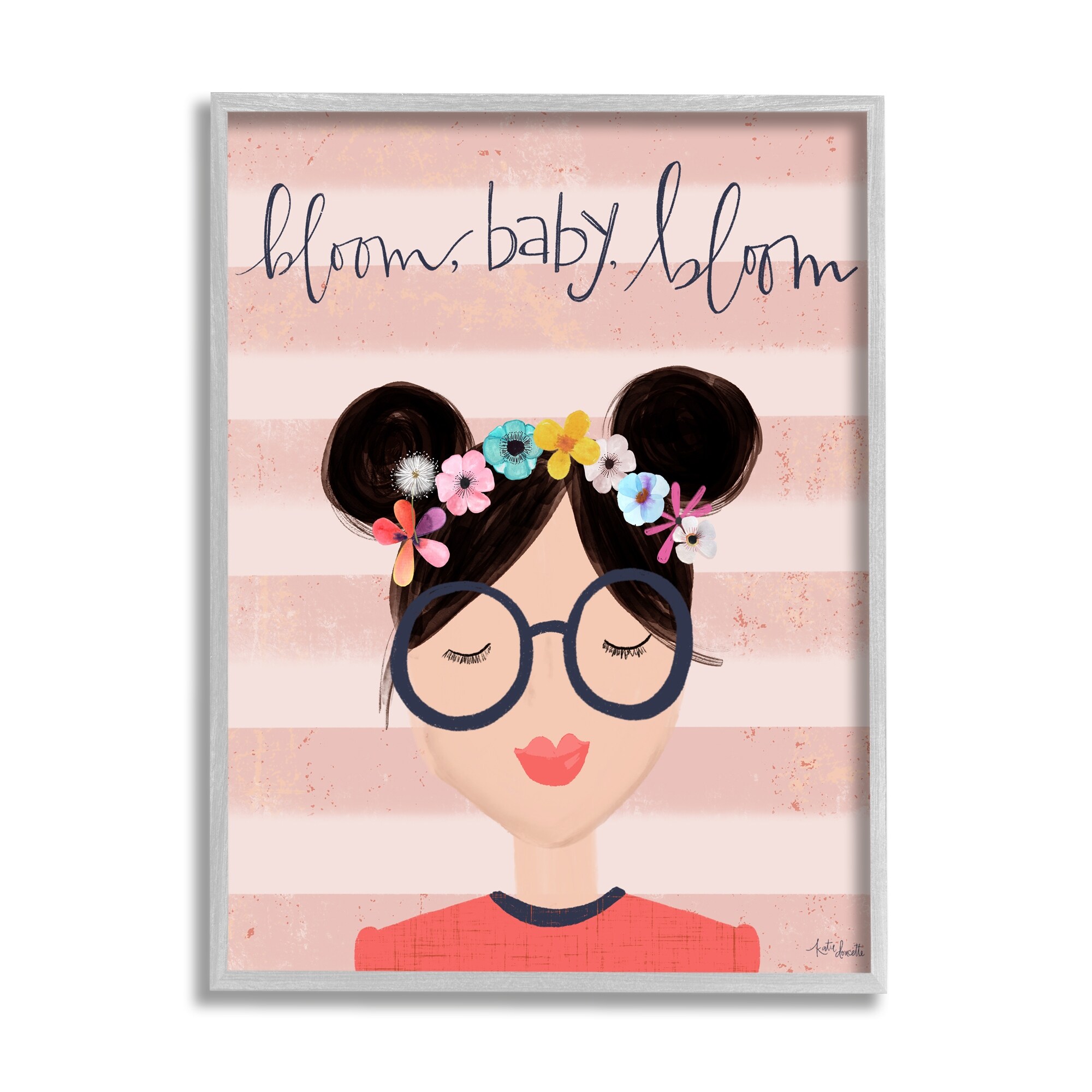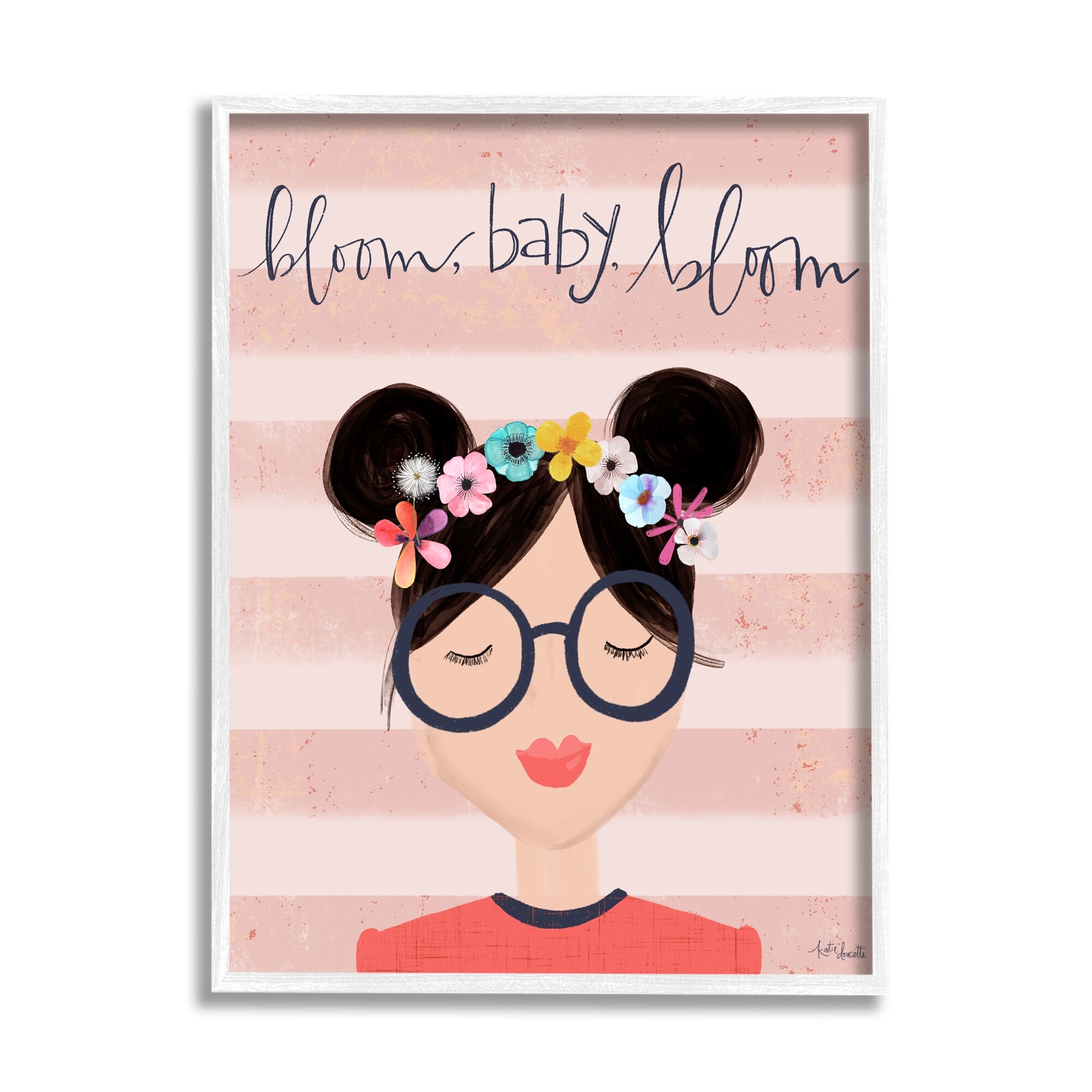 Stupell Industries Bloom Baby Bloom Phrase Pink Stripe Smiling Woman Framed Wall Art