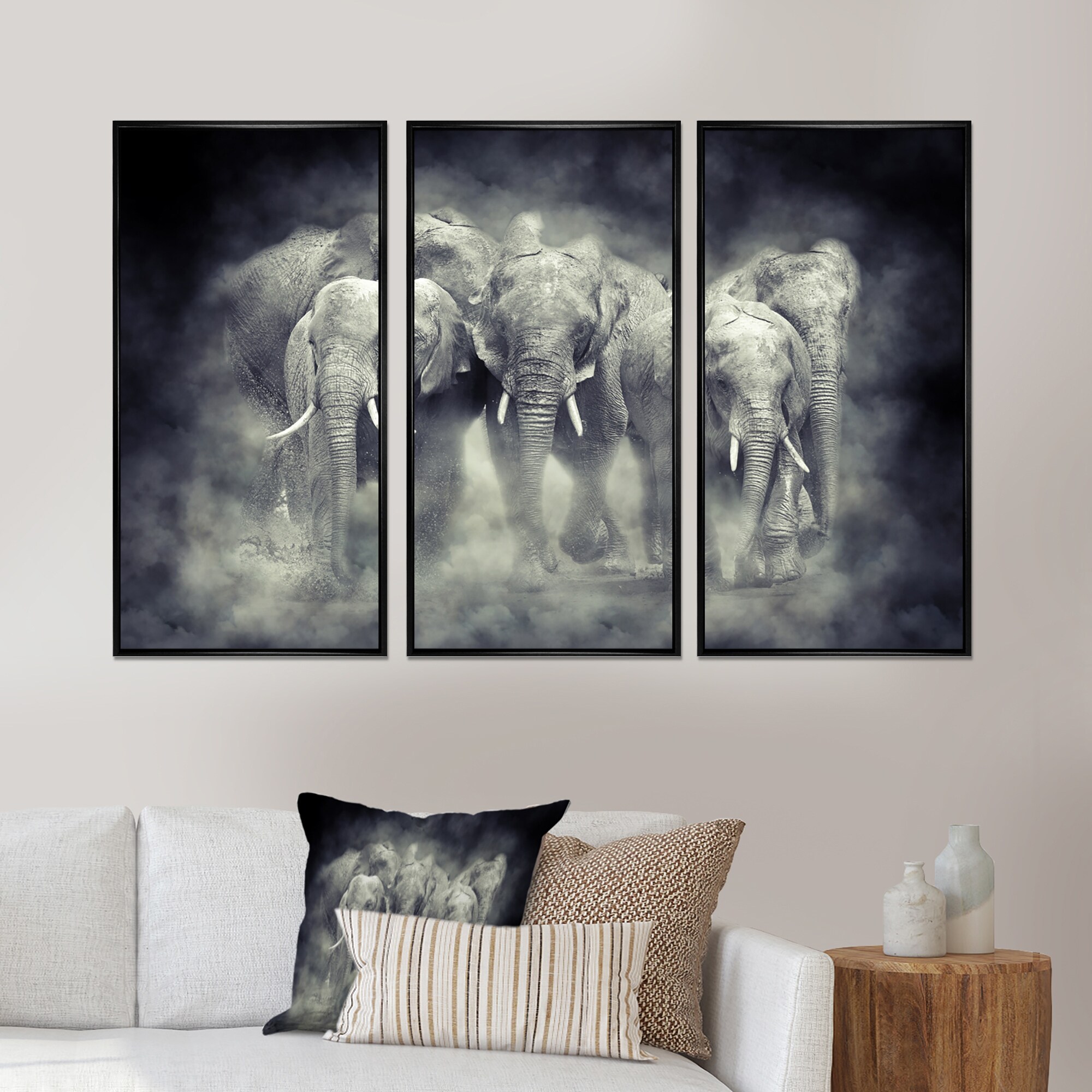 Designart "Kenya National Park Elephant in smoke" Animal Framed Wall Decor Set of 3 - 4 Colors of Frames