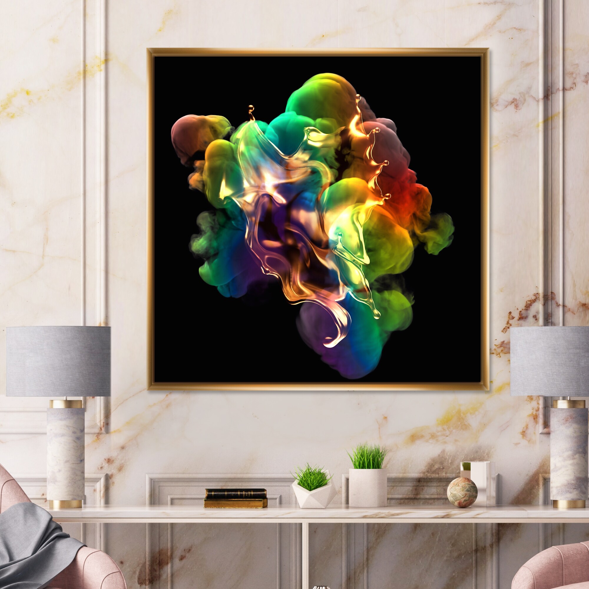 Designart "Splash Of Gold And Smoke Rainbow Color on A Black" Modern Framed Canvas Wall Art Print