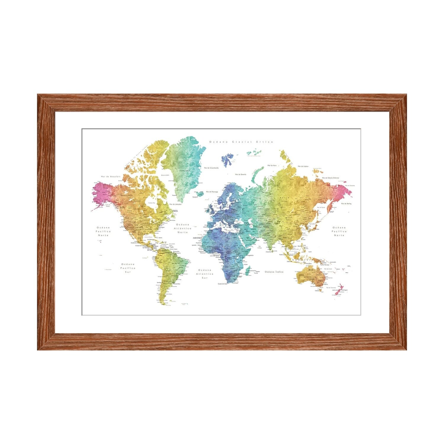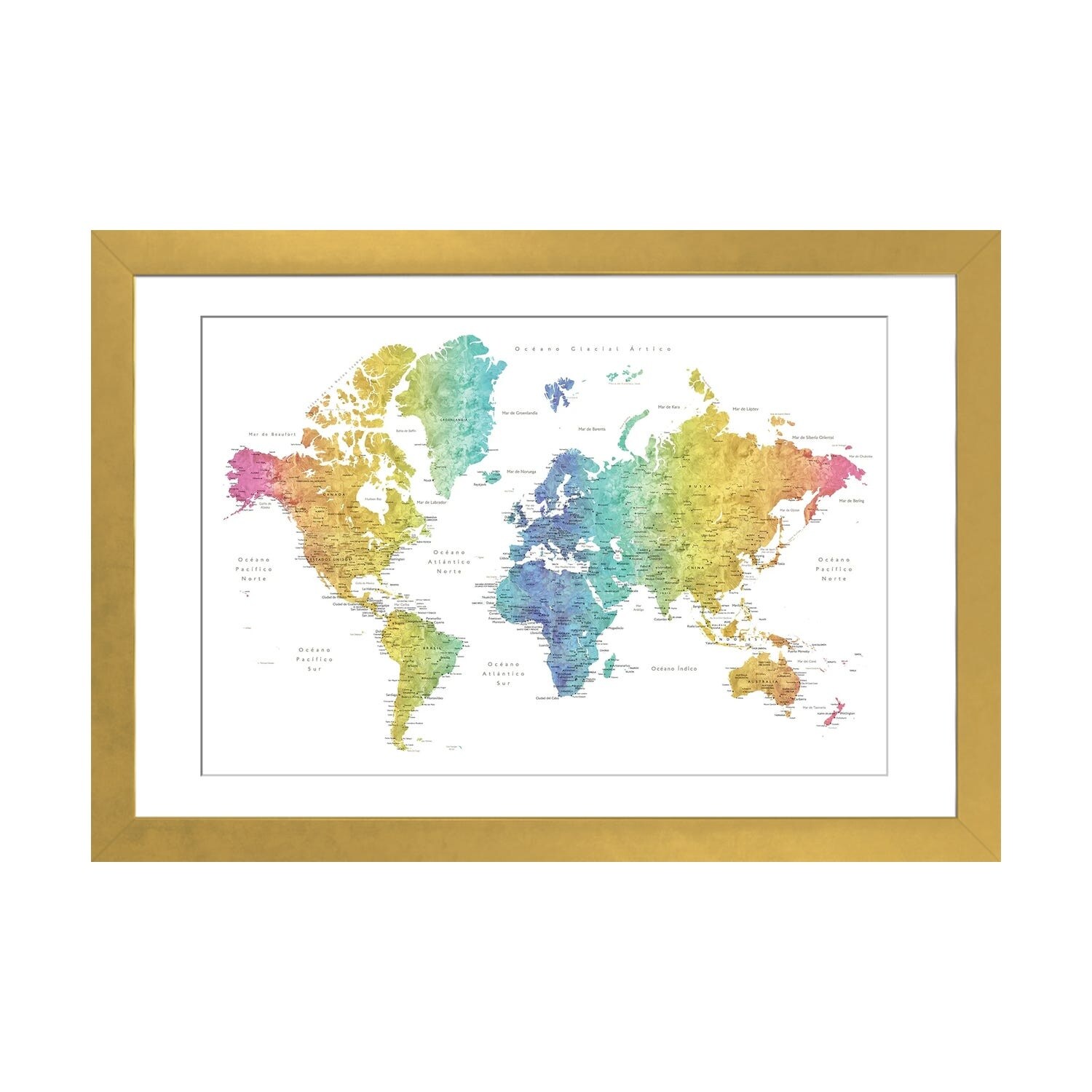 iCanvas "Labels In Spanish Rainbow Watercolor World Map" by blursbyai