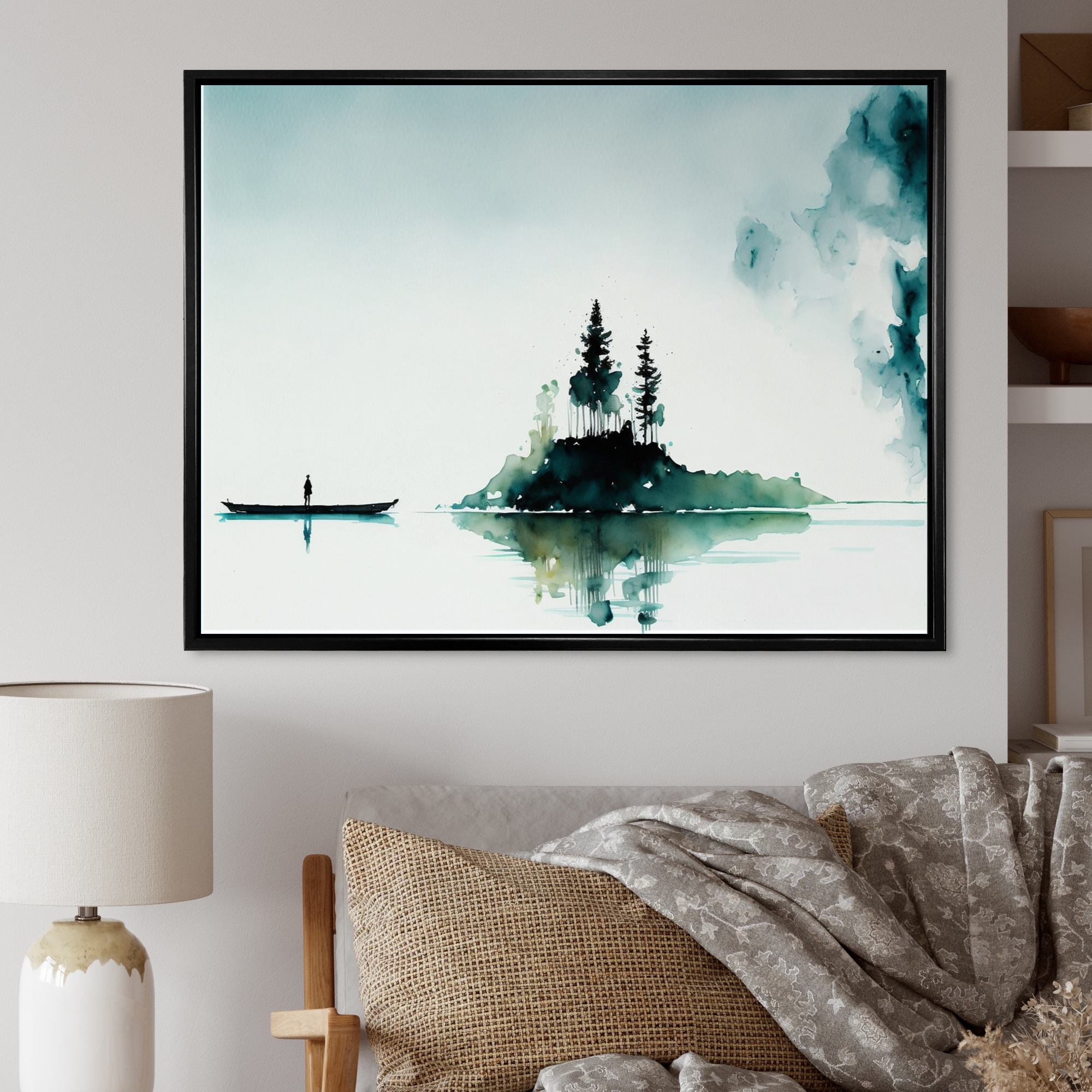 Designart "Little Boat By the Spanish Moss Island" Landscape Forest Framed Canvas Wall Art Print