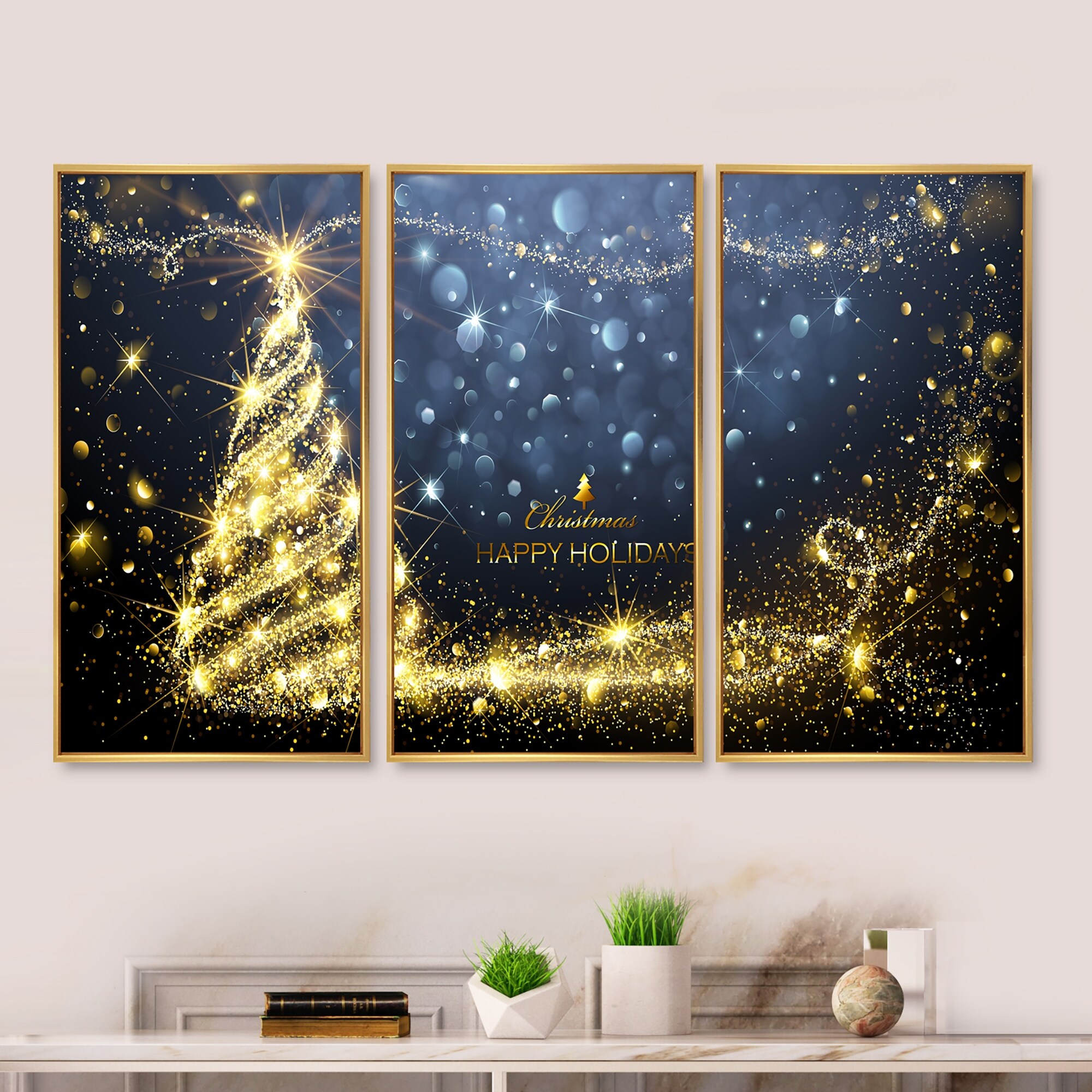 Designart "Sparkling Shining Light Christmas Tree" Contemporary Framed Canvas Wall Art Set of 3 - 4 Colors of Frames