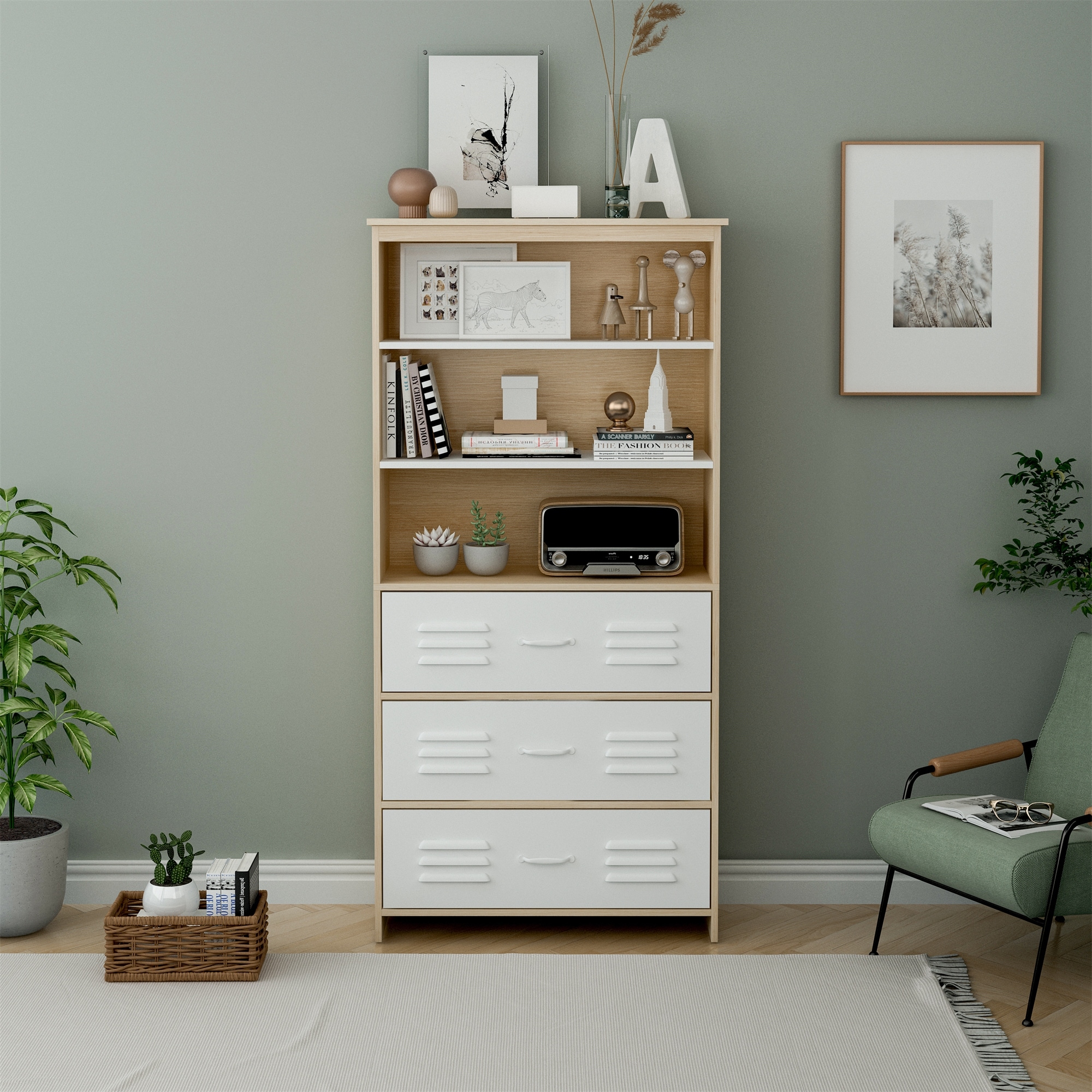 Merax Rustic Storage Cabinet with Two Drawers and Four Fabric Basket