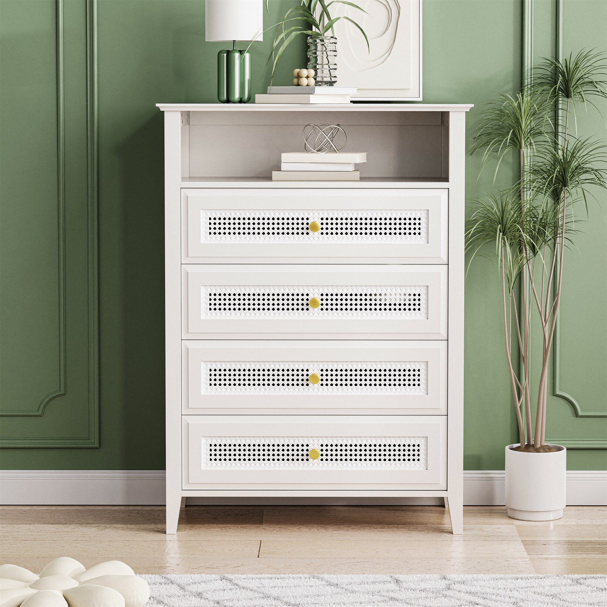 4-Drawer Storage Cabinet with Rattan Panels