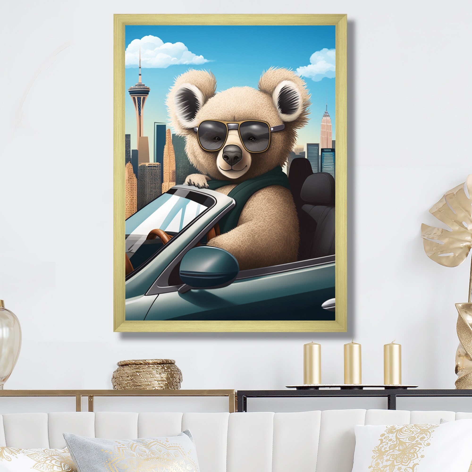 Designart "Grey Koala Wearing Sunglasses in Sportscar" Animals Koala Framed Wall Art Prints