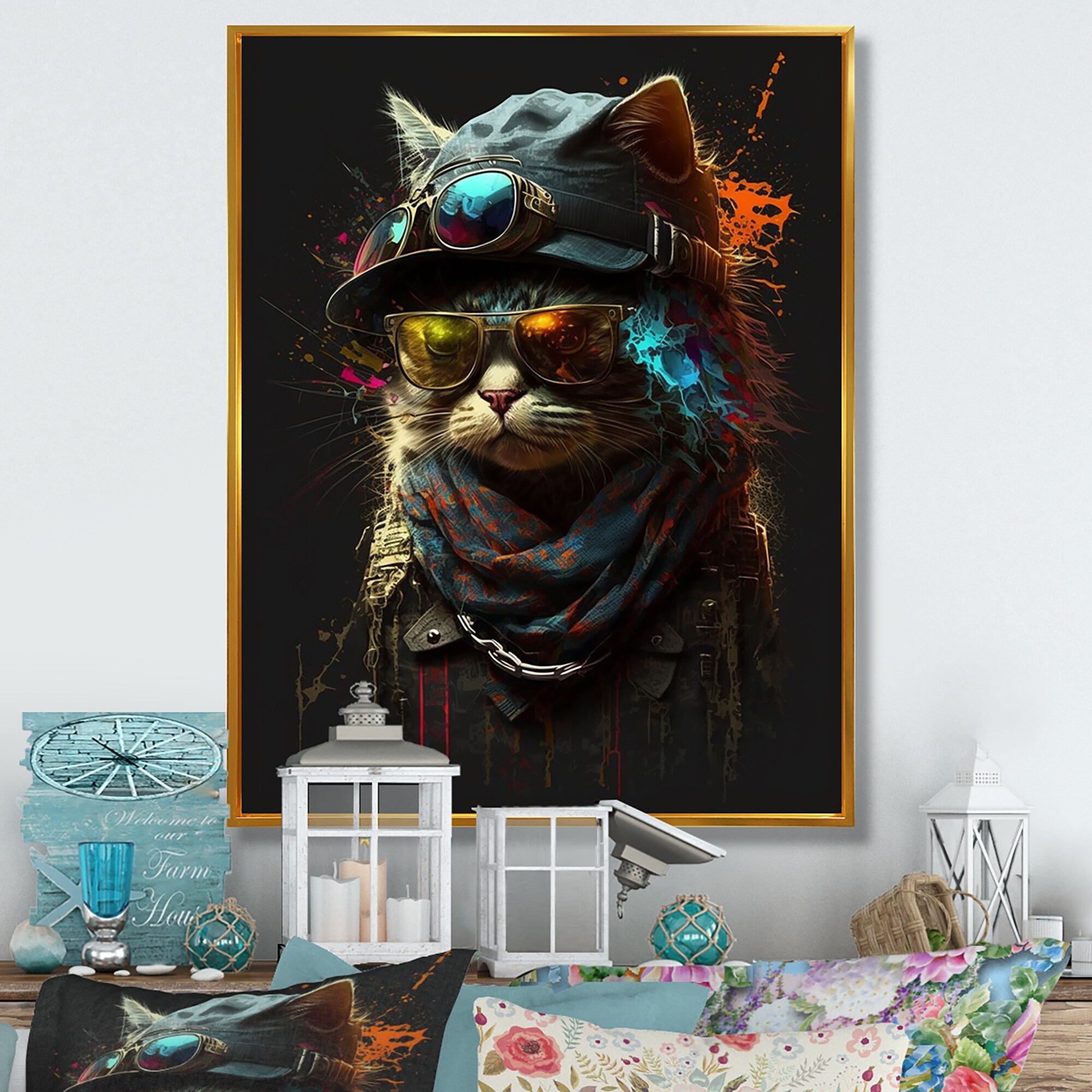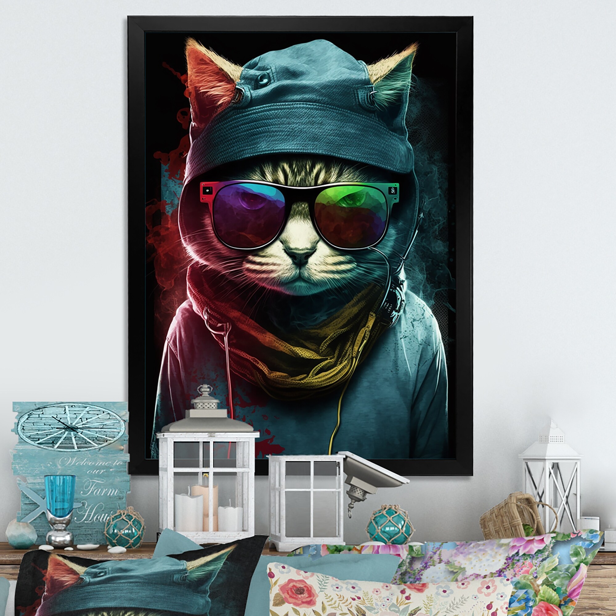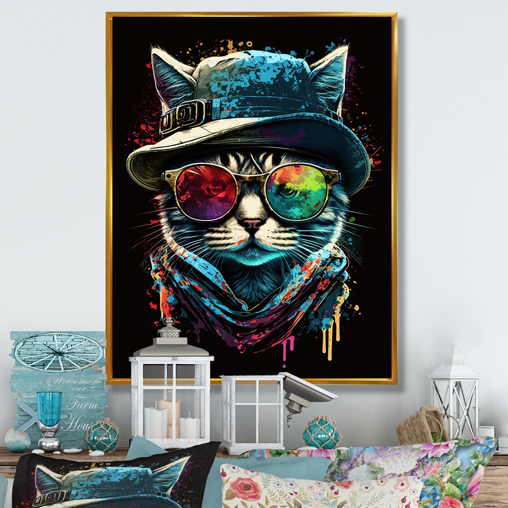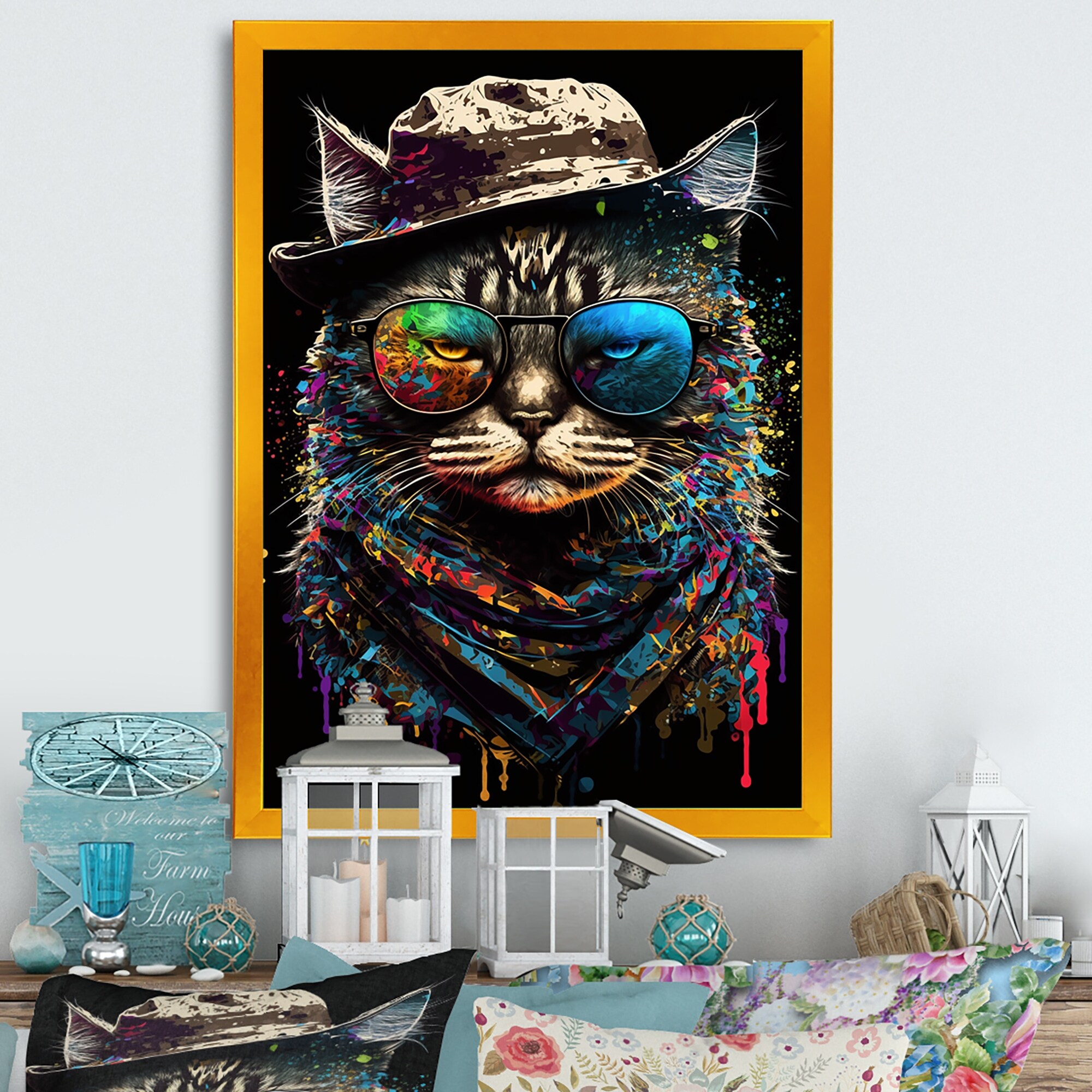 Designart "Bohemian Cat With Sunglasses III" Animals Cat Framed Canvas Wall Art Print