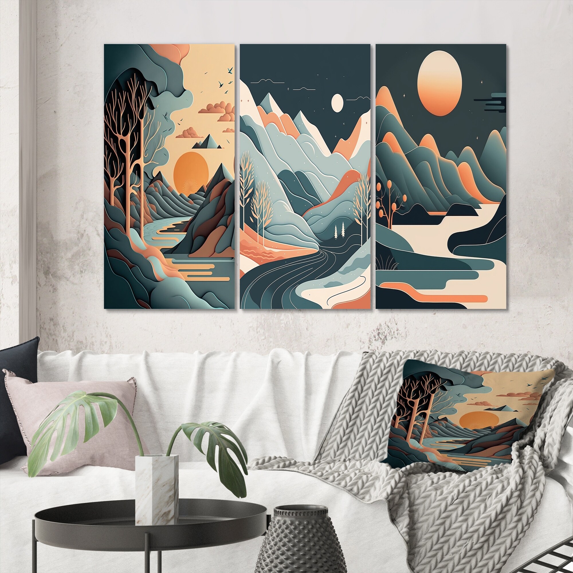 Designart "Mountain Trees in Retro Graphic Blue" Landscape Mountains Canvas Print Set of 3 Pieces