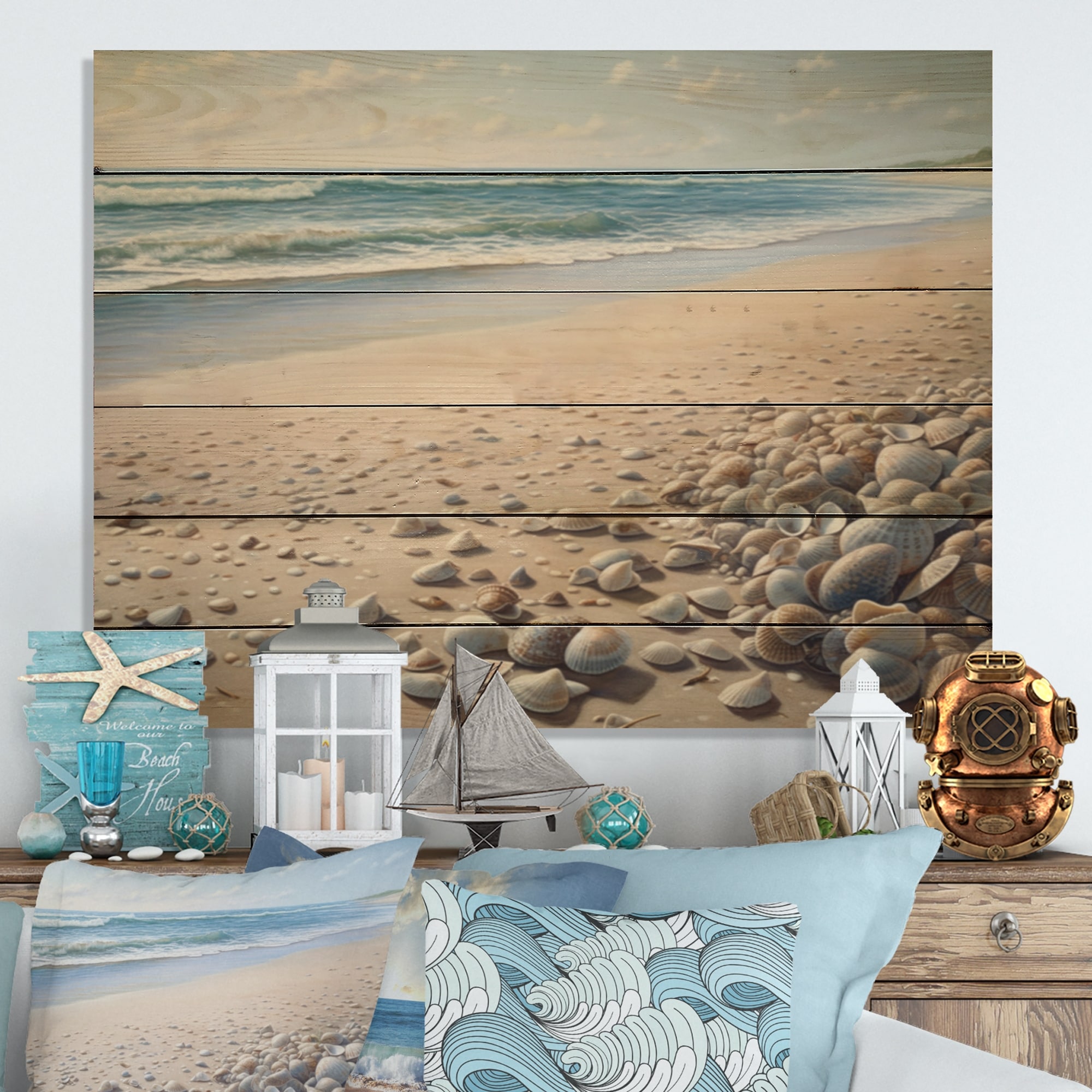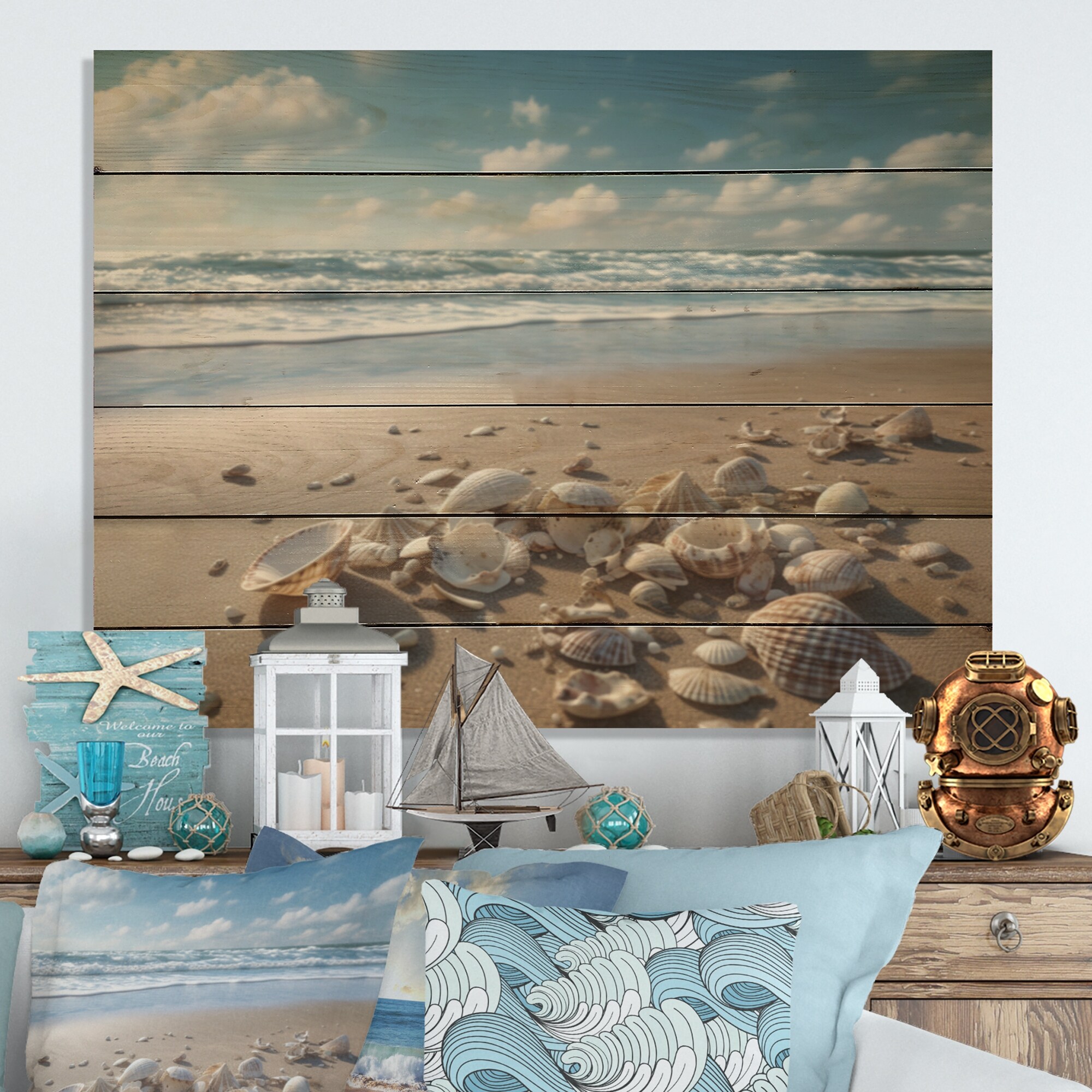 Designart "Seaside Seashell Treasures V" Modern Landscape Beach Print on Natural Pine Wood
