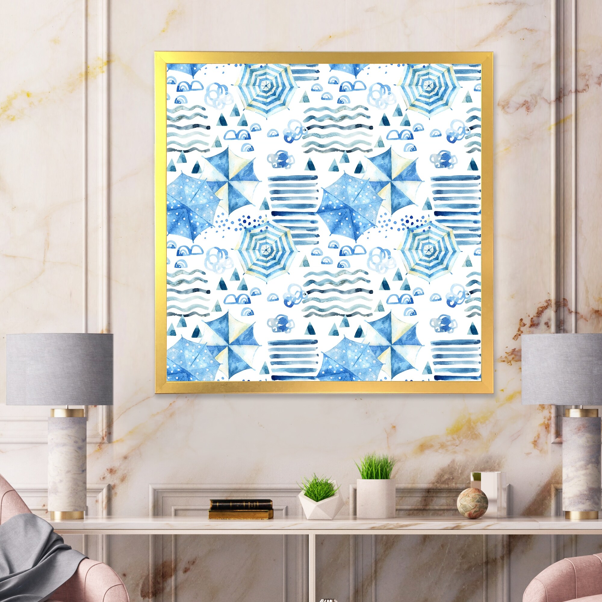 Designart "Vacation Sun With Water Waves Sun And Umbrella IV" Patterned Framed Art Print