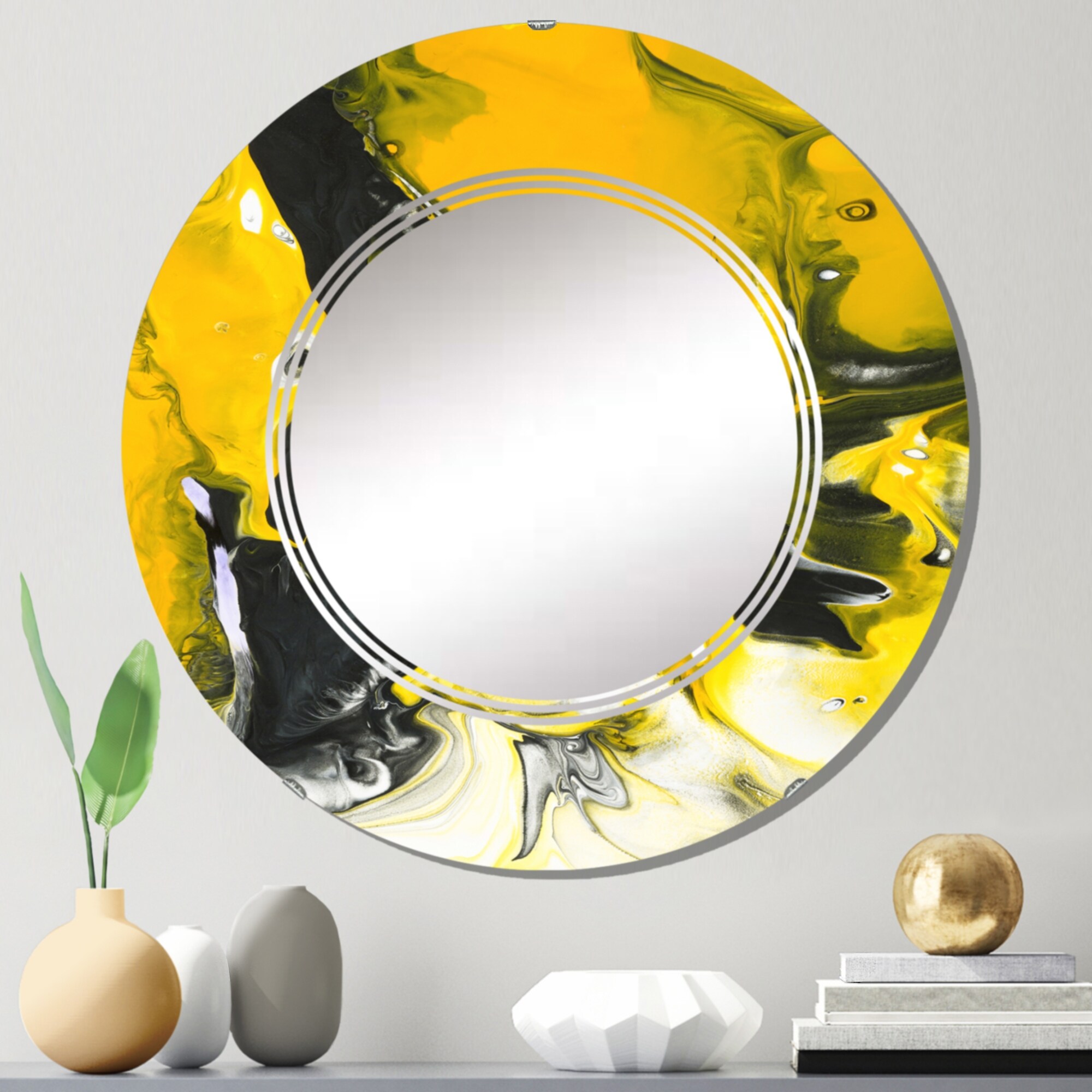 Designart 'Yellow Black And White Liquid Art VII' Printed Modern Wall Mirror