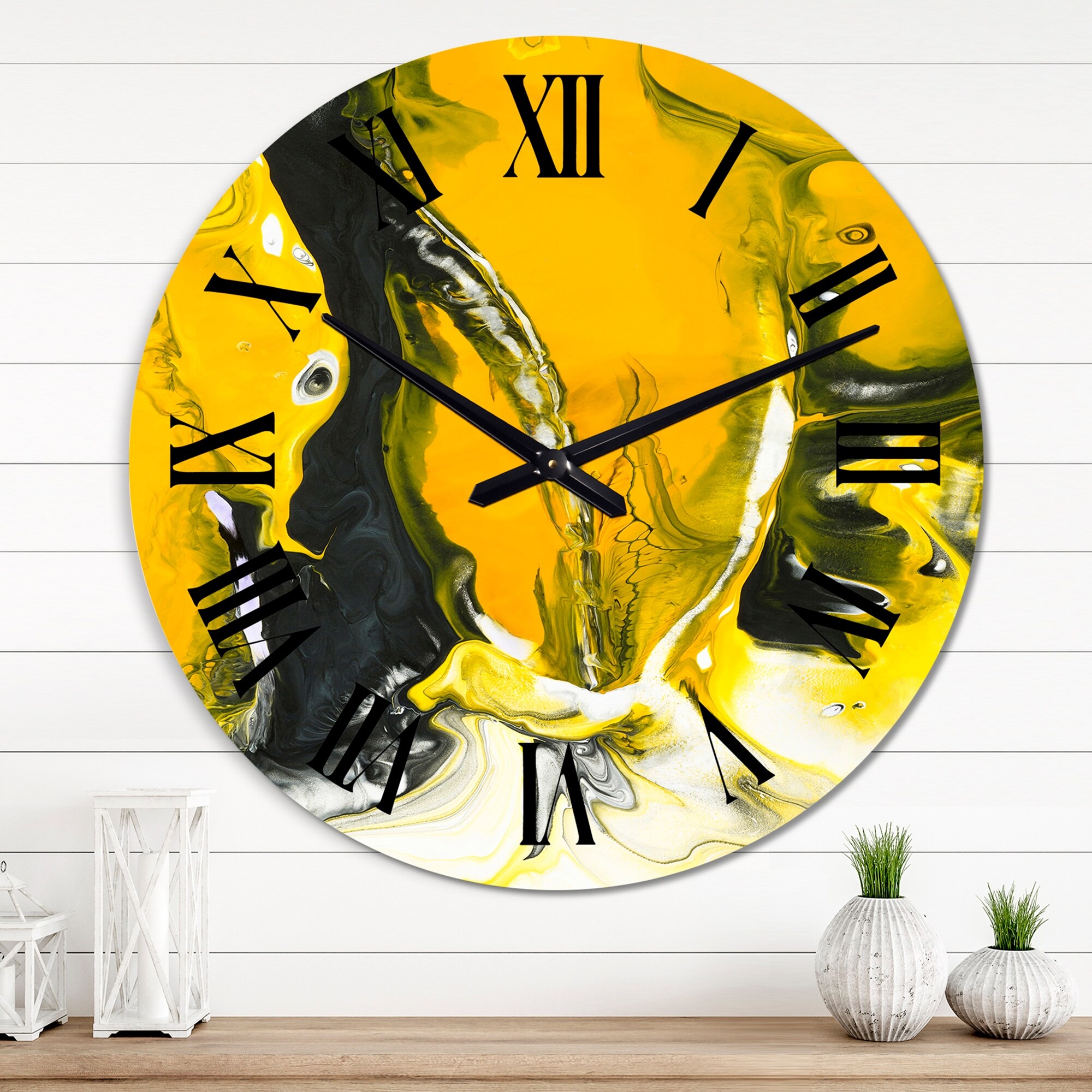 Designart 'Yellow Black And White Liquid Art VII' Modern wall clock