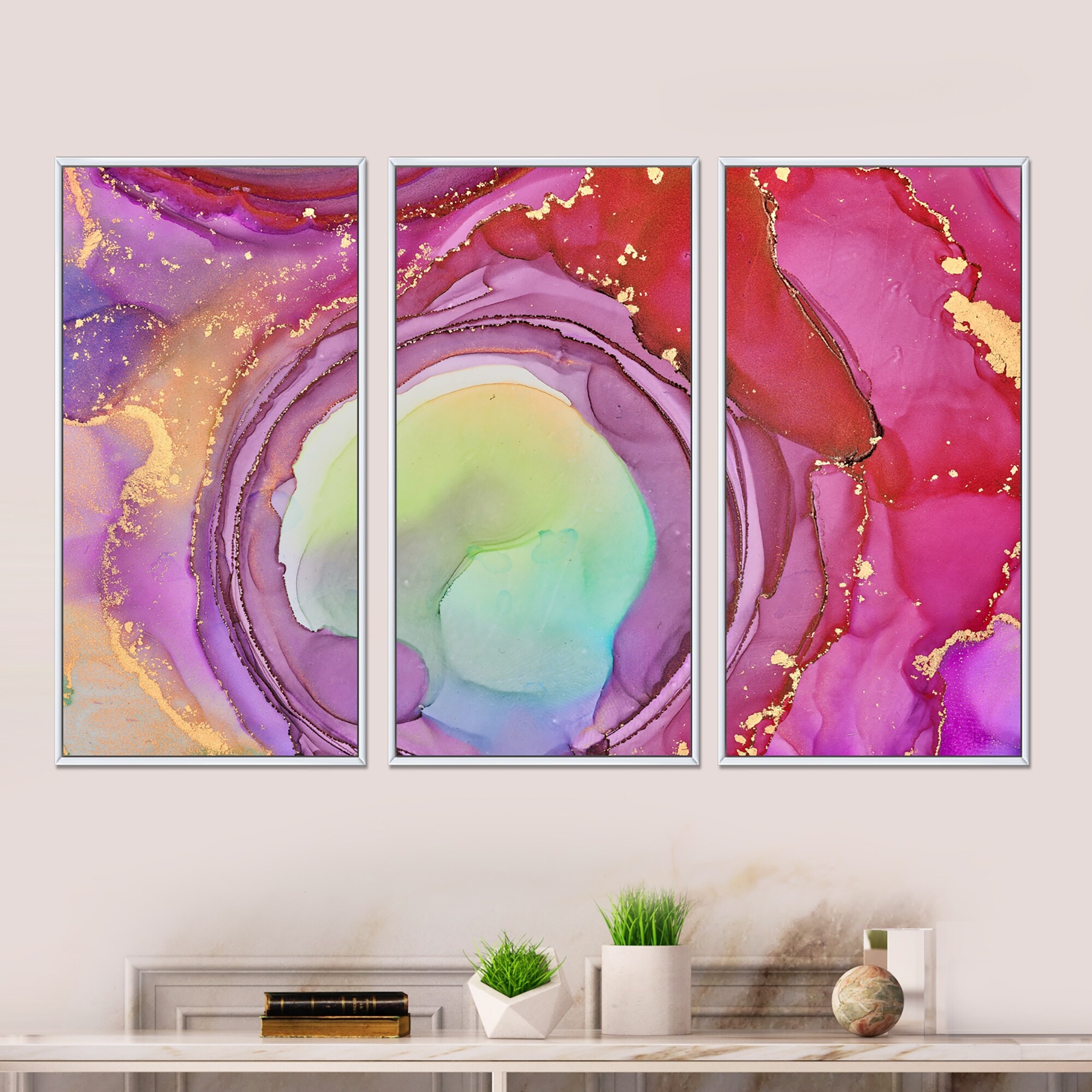 Designart "Viva Magenta Secret Wispers VII" Abstract Liquid Ink Framed Canvas Wall Art Print - 3 Panels