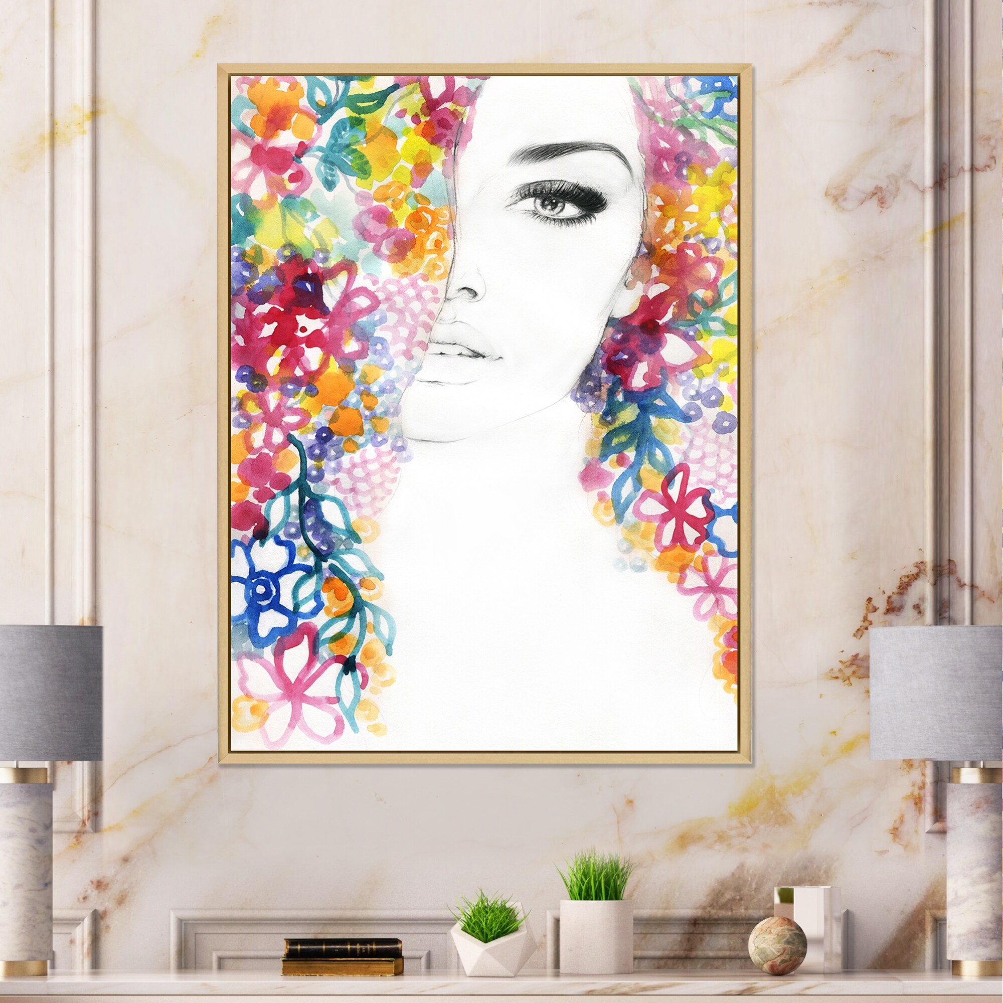Designart "Floral Woman Portrait III" Glam Framed Canvas Wall Art