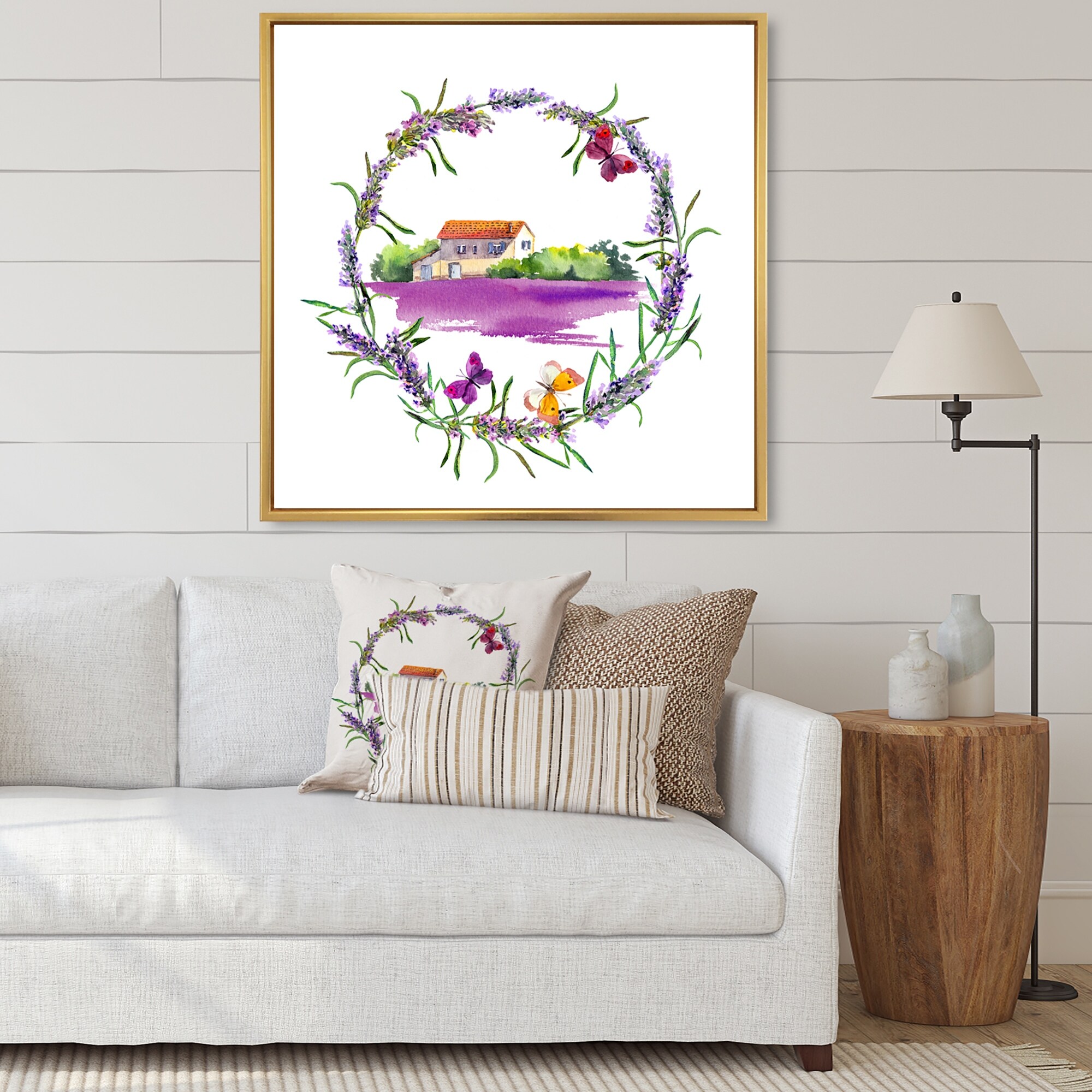 Designart "Rural Farm And Lavender Field in Garland" Country Framed Canvas Wall Art Print