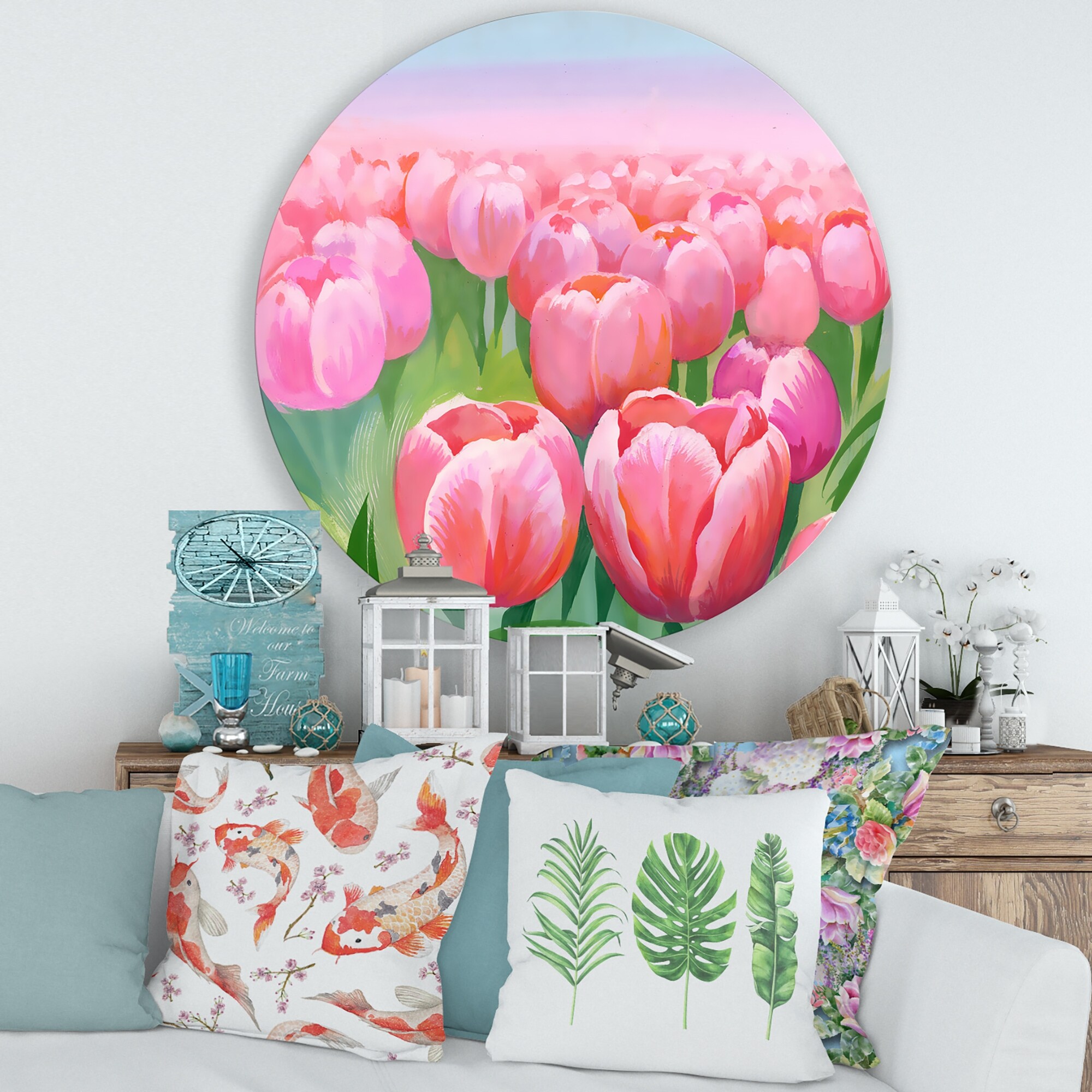 Designart 'Field of Pink Tulips' Traditional Metal Circle Wall Art