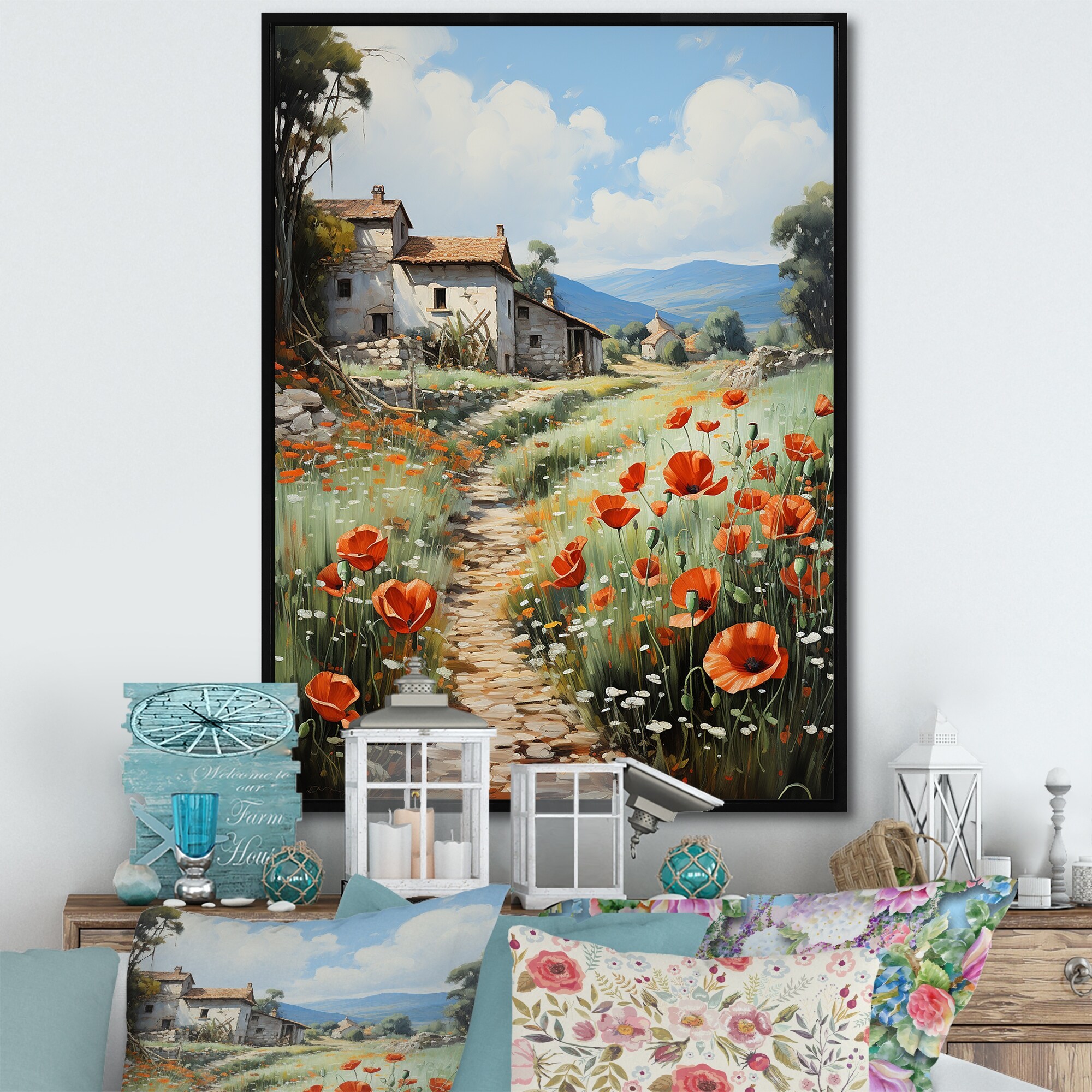 Designart "Poppy Field in Farm" Poppies Framed Canvas Wall Art