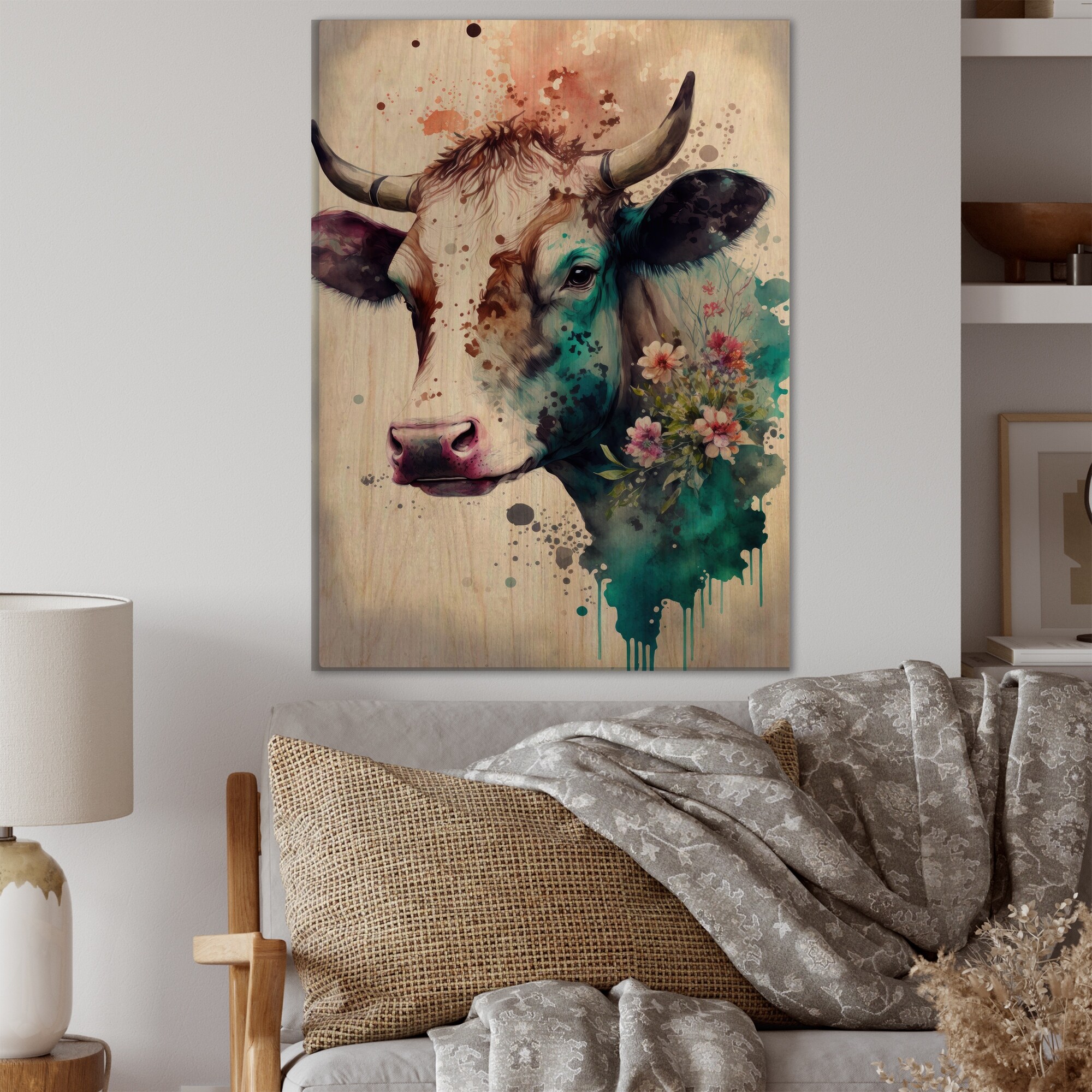 Designart 'Cute Cow Floral Art I' Animals Cow Wood Wall Art - Natural Pine Wood
