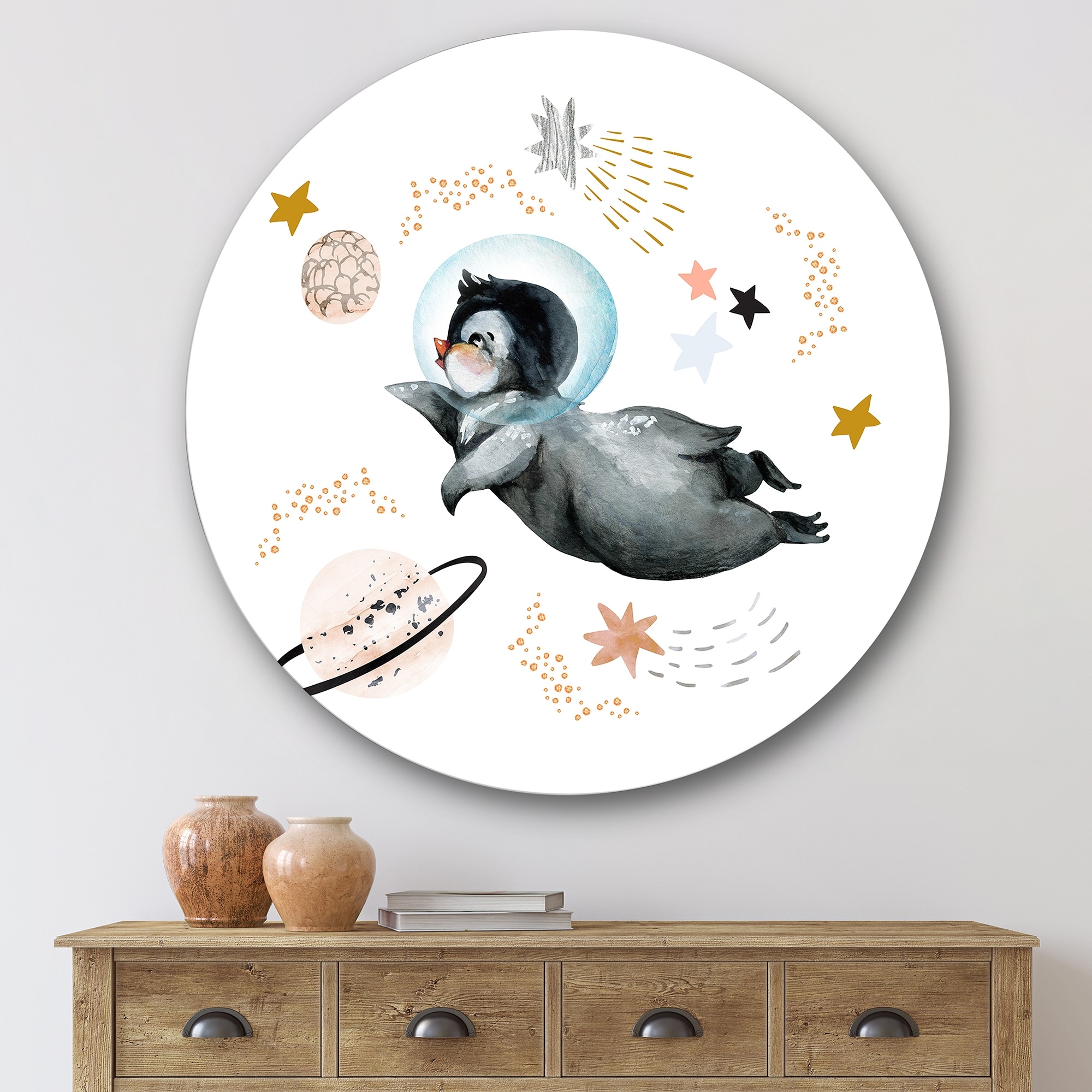 Designart 'Little Penguin Flying Stars and Planets II' Farmhouse Metal Circle Wall Art