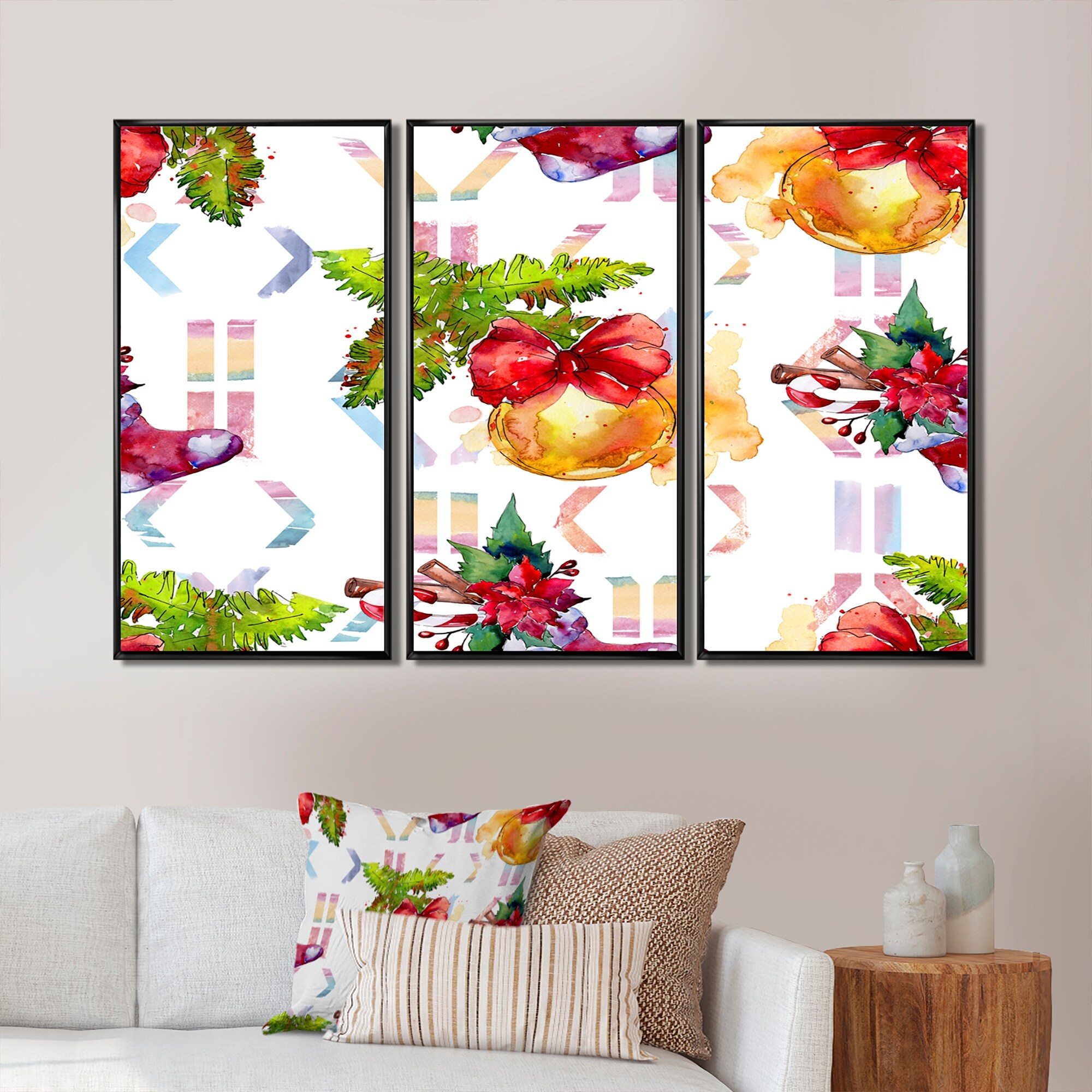 Designart "Christmas Winter Holiday Symbols" Patterned Framed Wall Art Set of 3 - 4 Colors of Frames