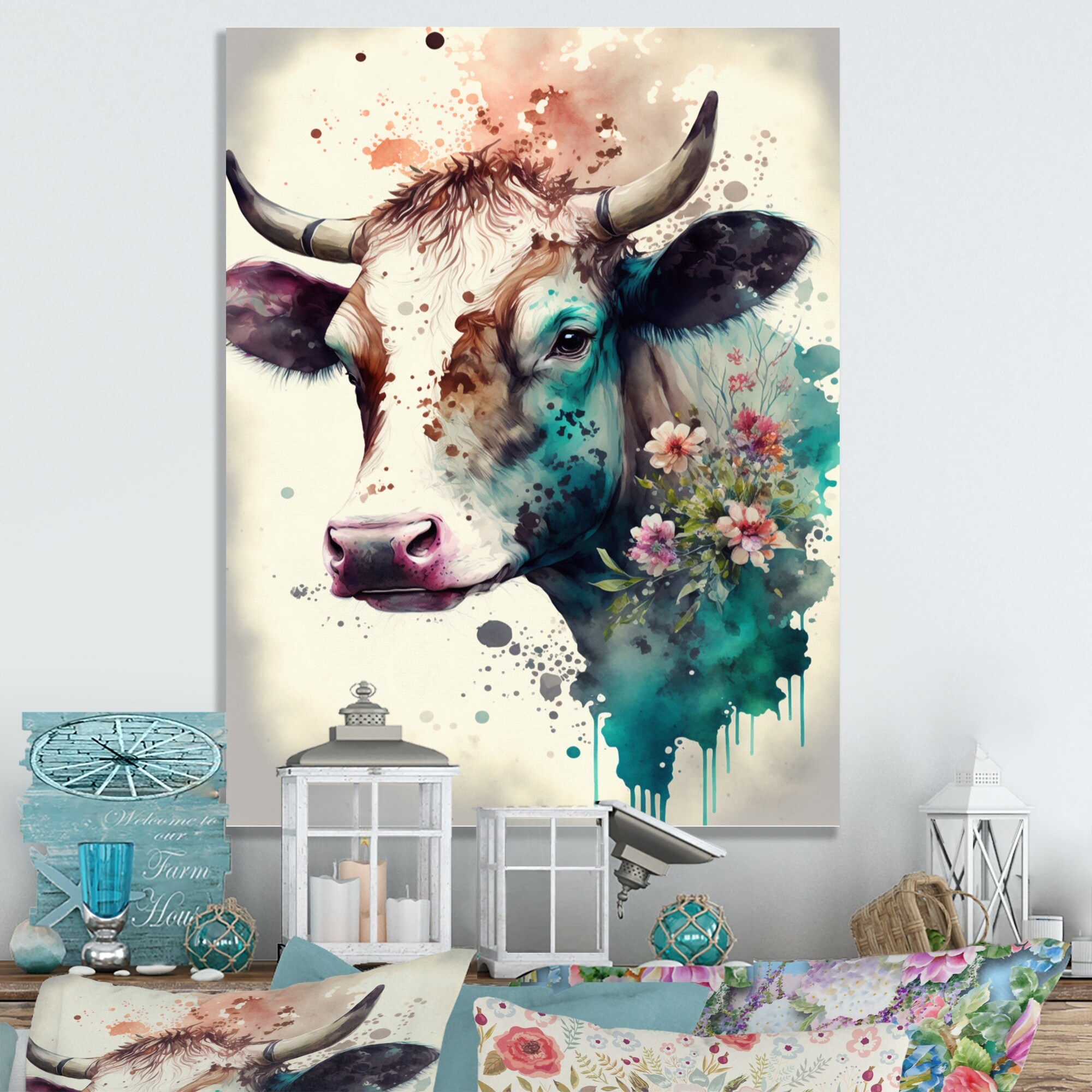 Designart 'Cute Cow Floral Art I' Animals Canvas Wall Art