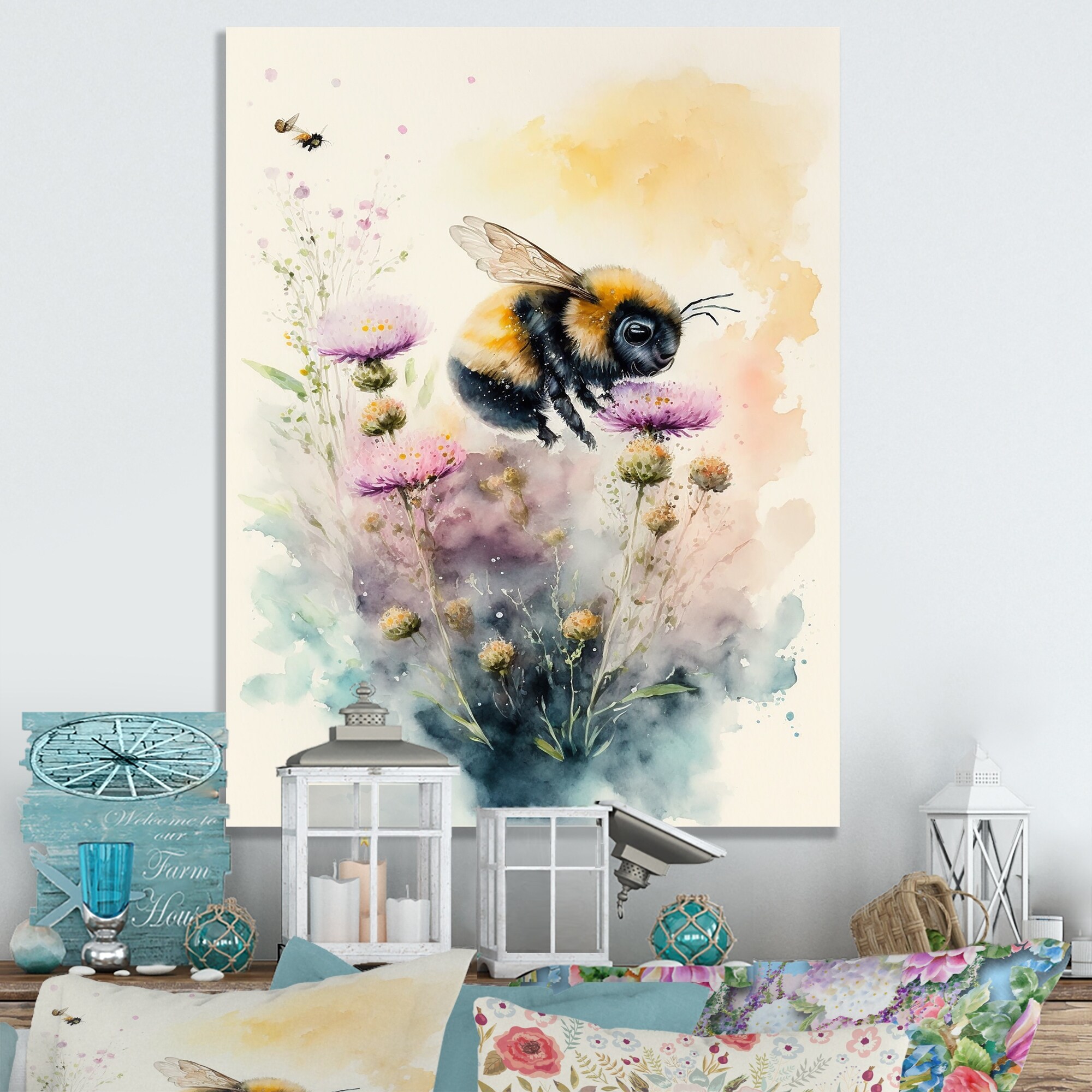 Designart "Bee Flying to A Flower Watercolour III" Animals Bee Canvas Wall Art
