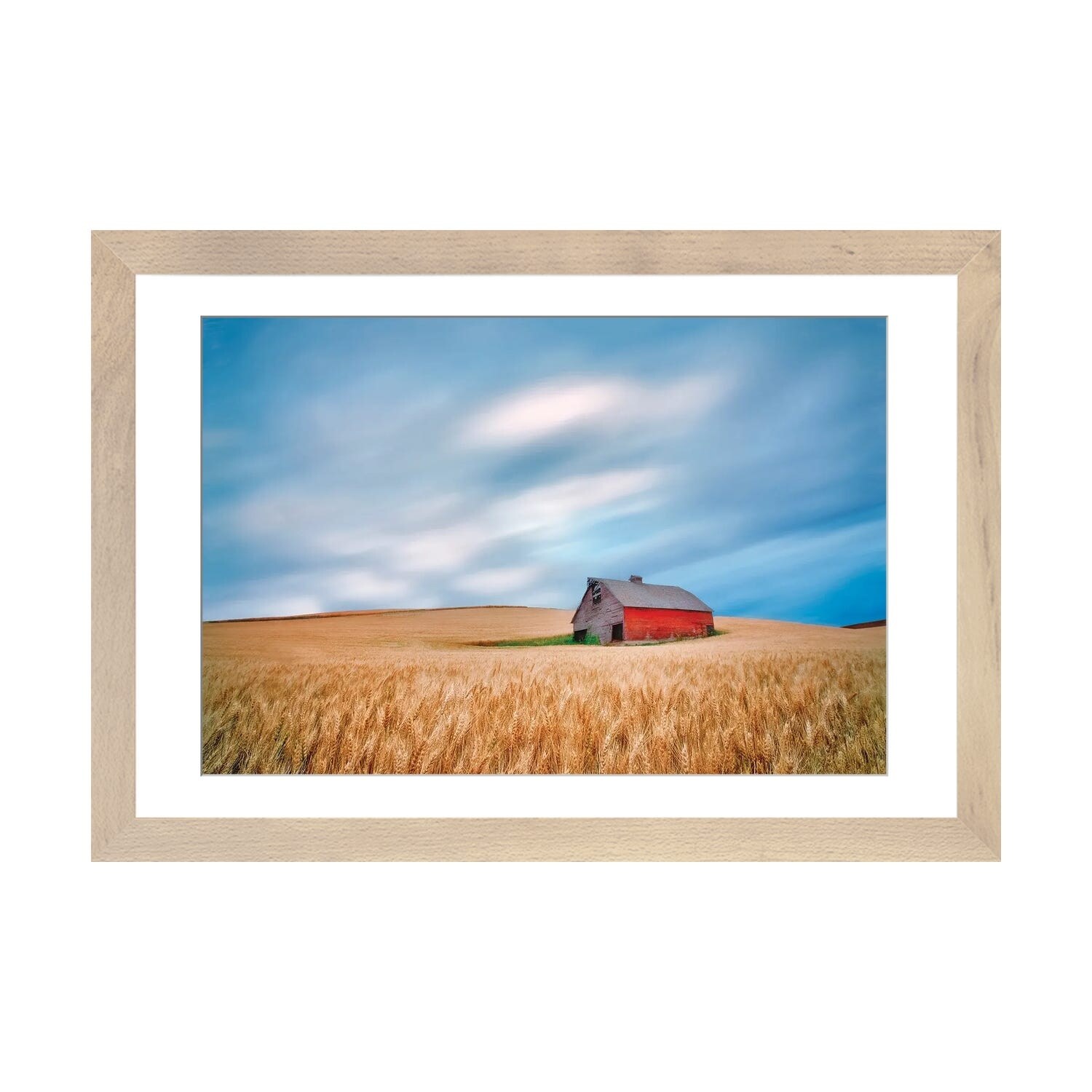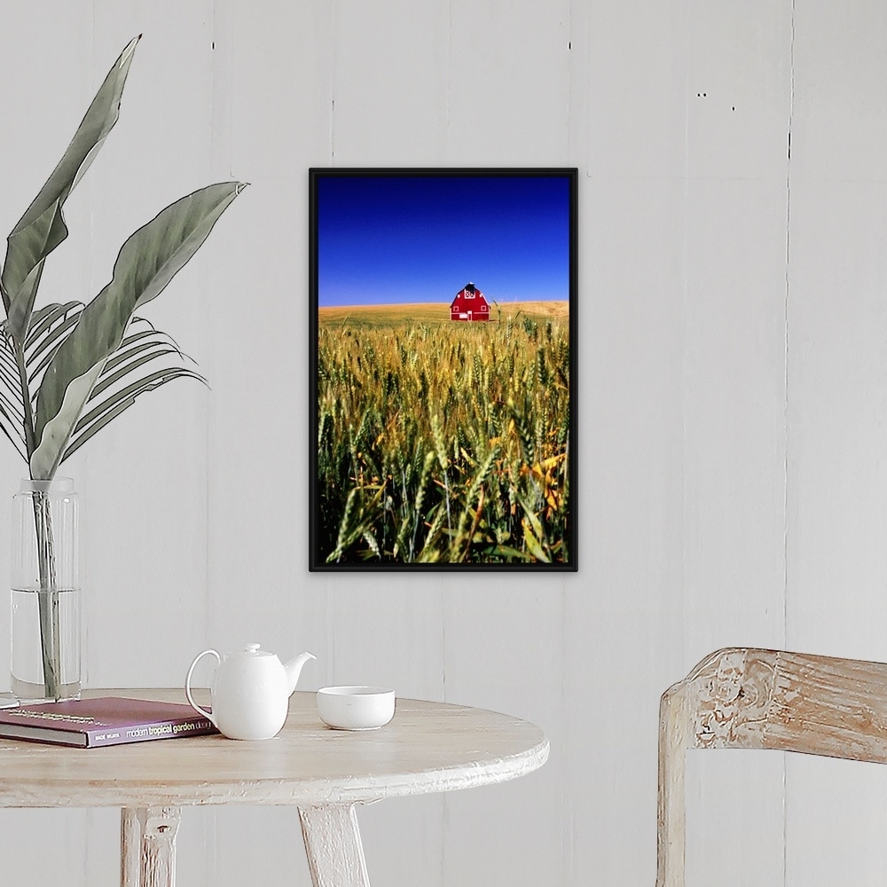 "Red barn in wheat field" Black Float Frame Canvas Art