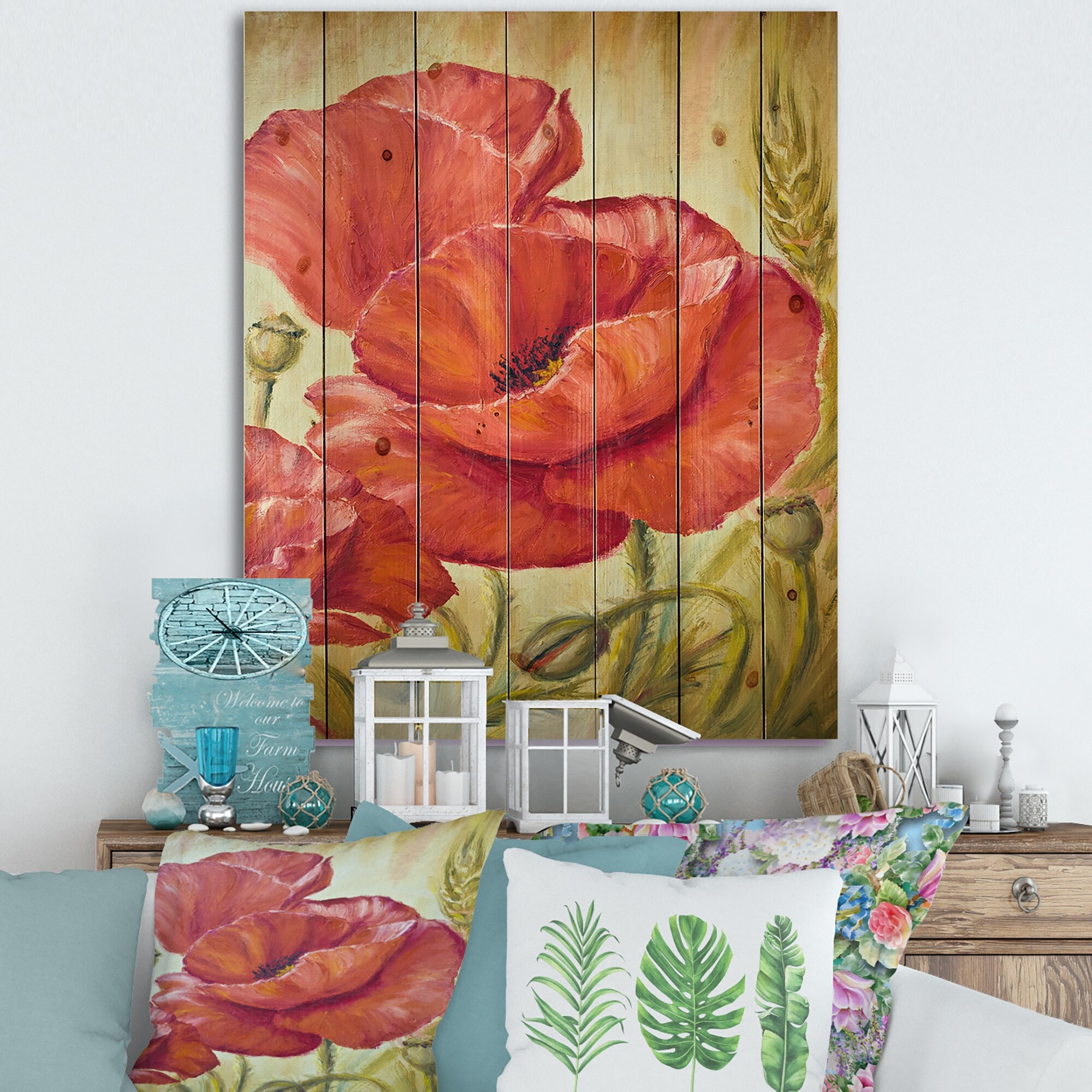 Designart 'Blossoming Poppies in Wheat Fields I' Traditional Print on Natural Pine Wood