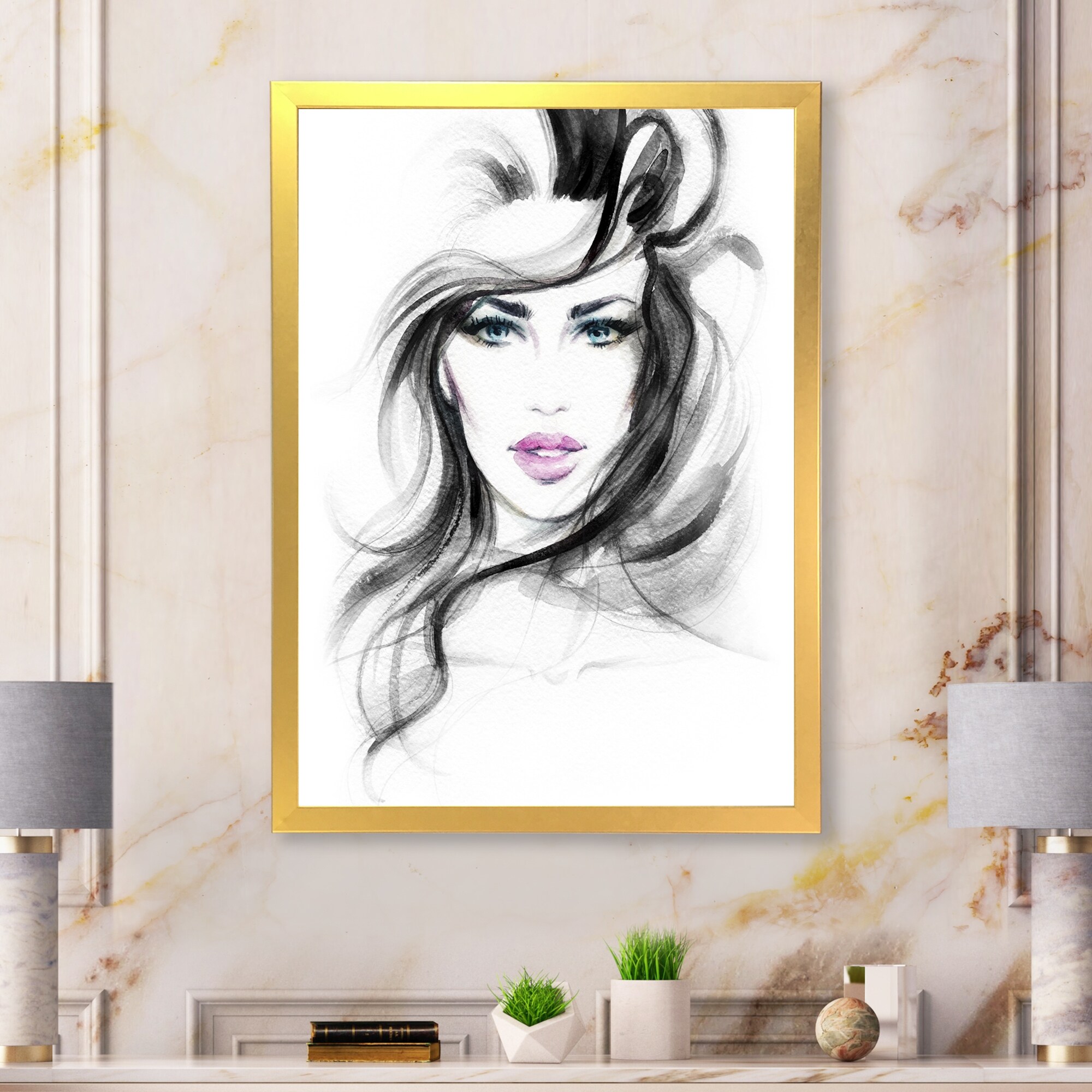 Designart "Black And White Glam Woman Portrait" Glam Framed Wall Art