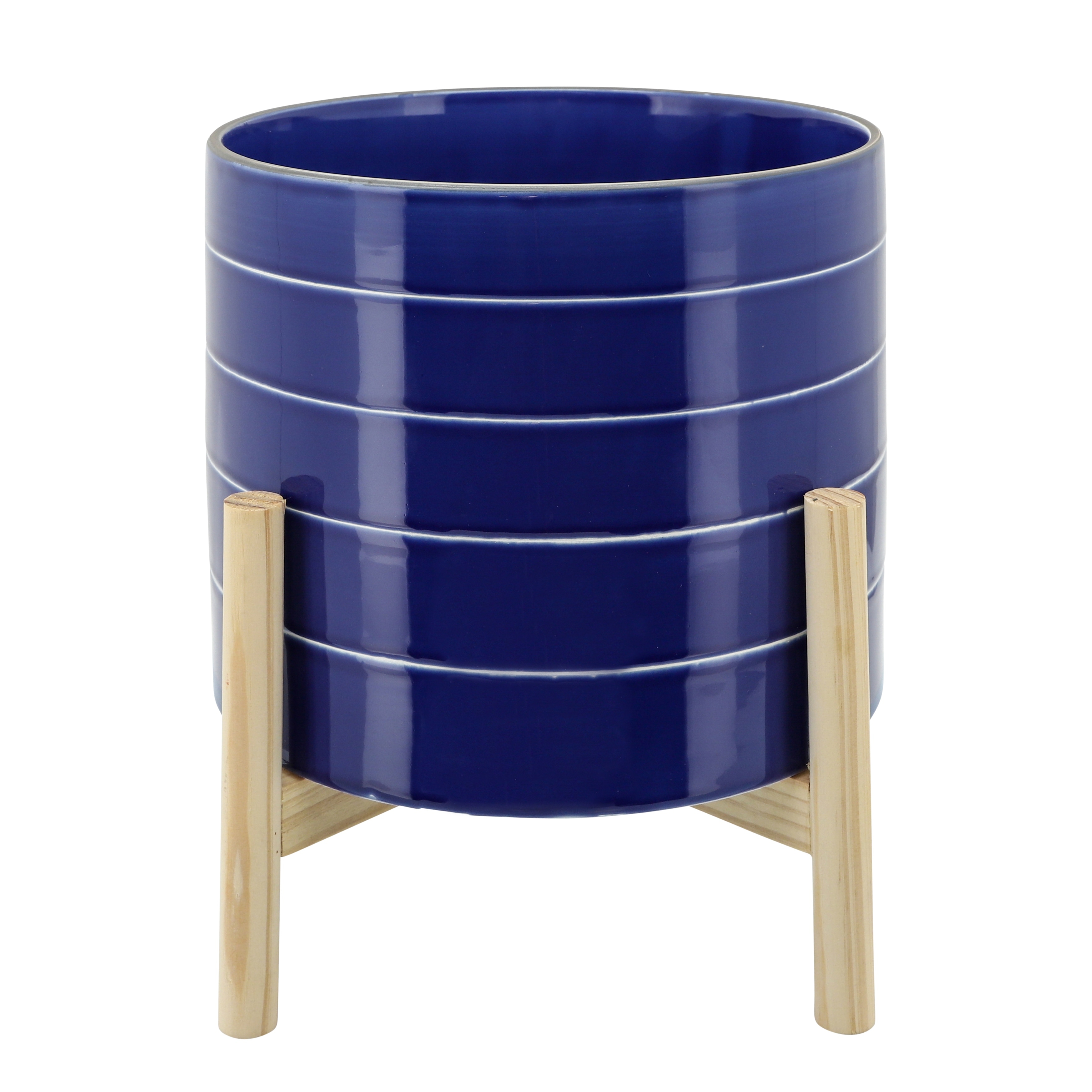 Navy Blue Ceramic Planter with White Stripes on Wood Stand - 10.0" x 10.0" x 8.0"