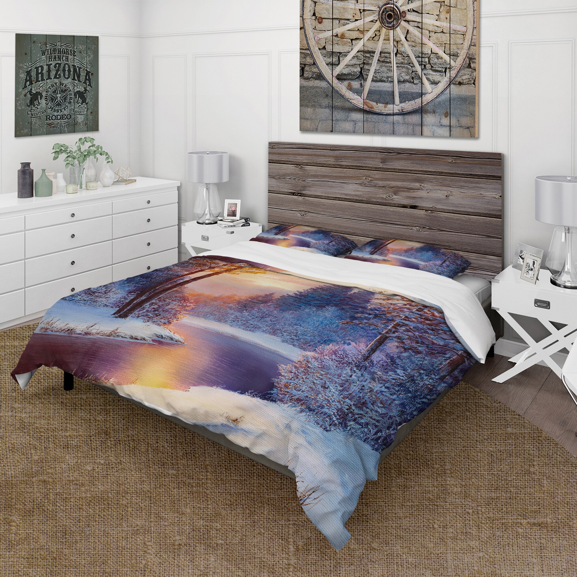 Designart 'Winding River With Dark Blue Silhouettes of Trees' Lake House Duvet Cover Set