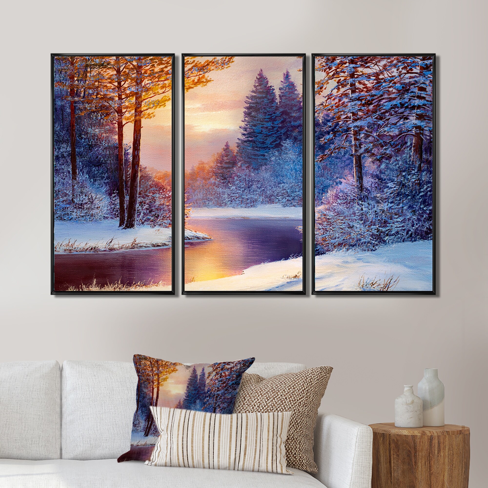 Designart "Winding River With Dark Blue Silhouettes of Trees" Lake House Framed Art Prints Set of 3 - 4 Colors of Frames