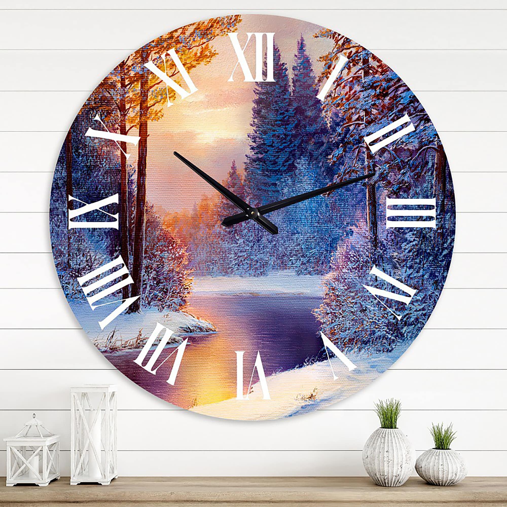 Designart 'Winding River With Dark Blue Silhouettes of Trees' Lake House wall clock