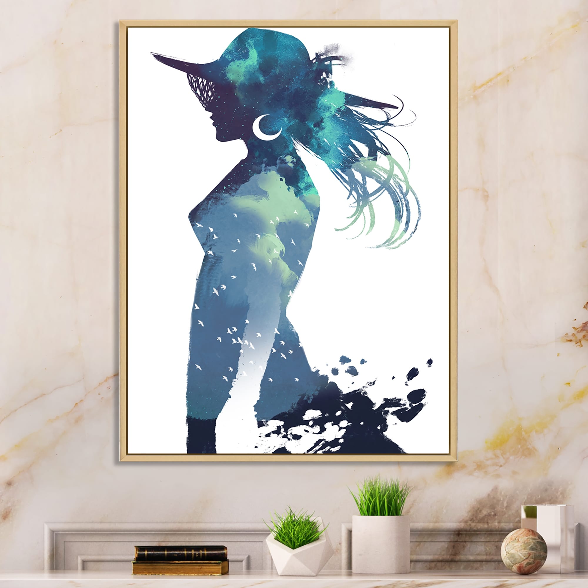 Designart "Blue And Gold Goddess Geometrics II" Modern Woman Framed Canvas Wall Art Print