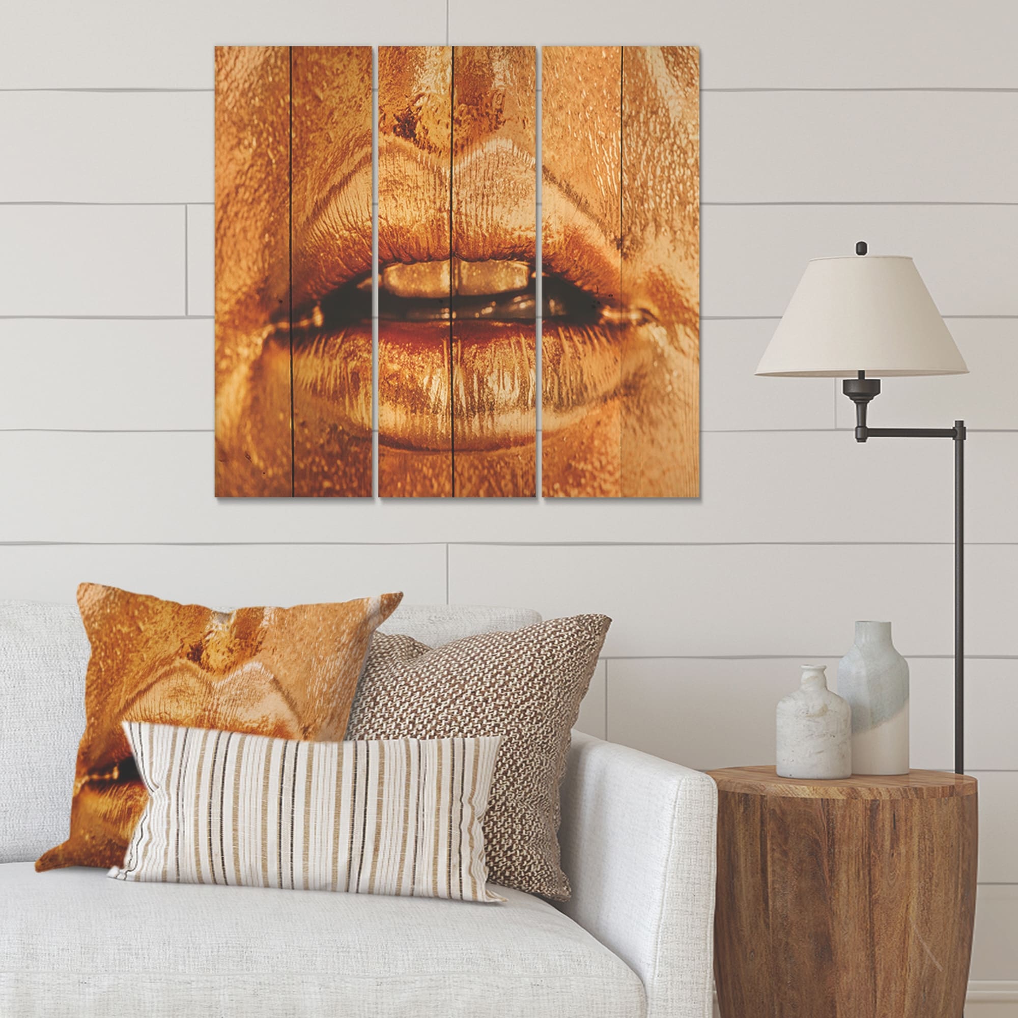 Designart 'Close Up of Woman Lips With Bright Golden Makeup' Modern Print on Natural Pine Wood - 3 Panels