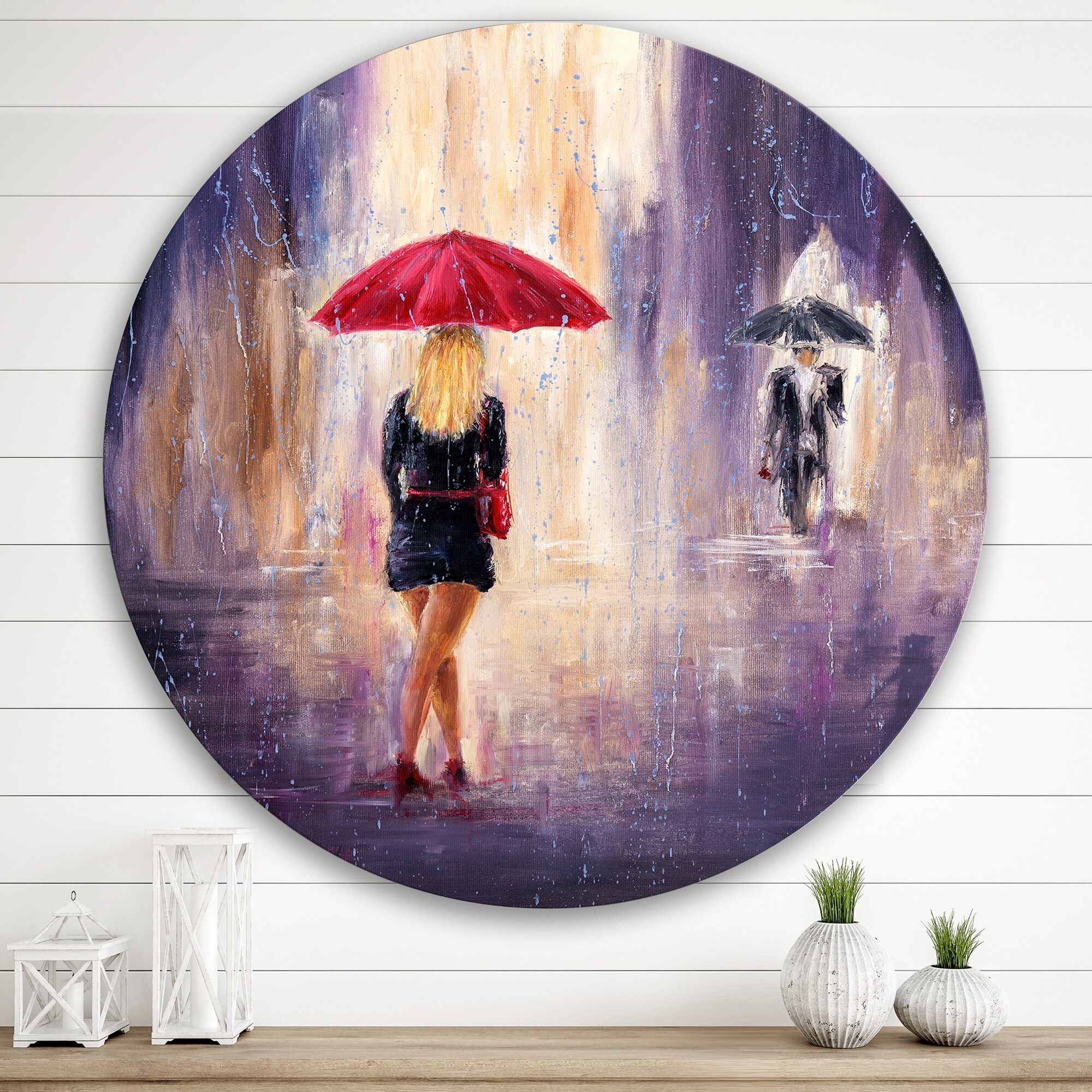 Designart 'The Woman With the Umbrella Walking in the Rain II' French Country Metal Circle Wall Art