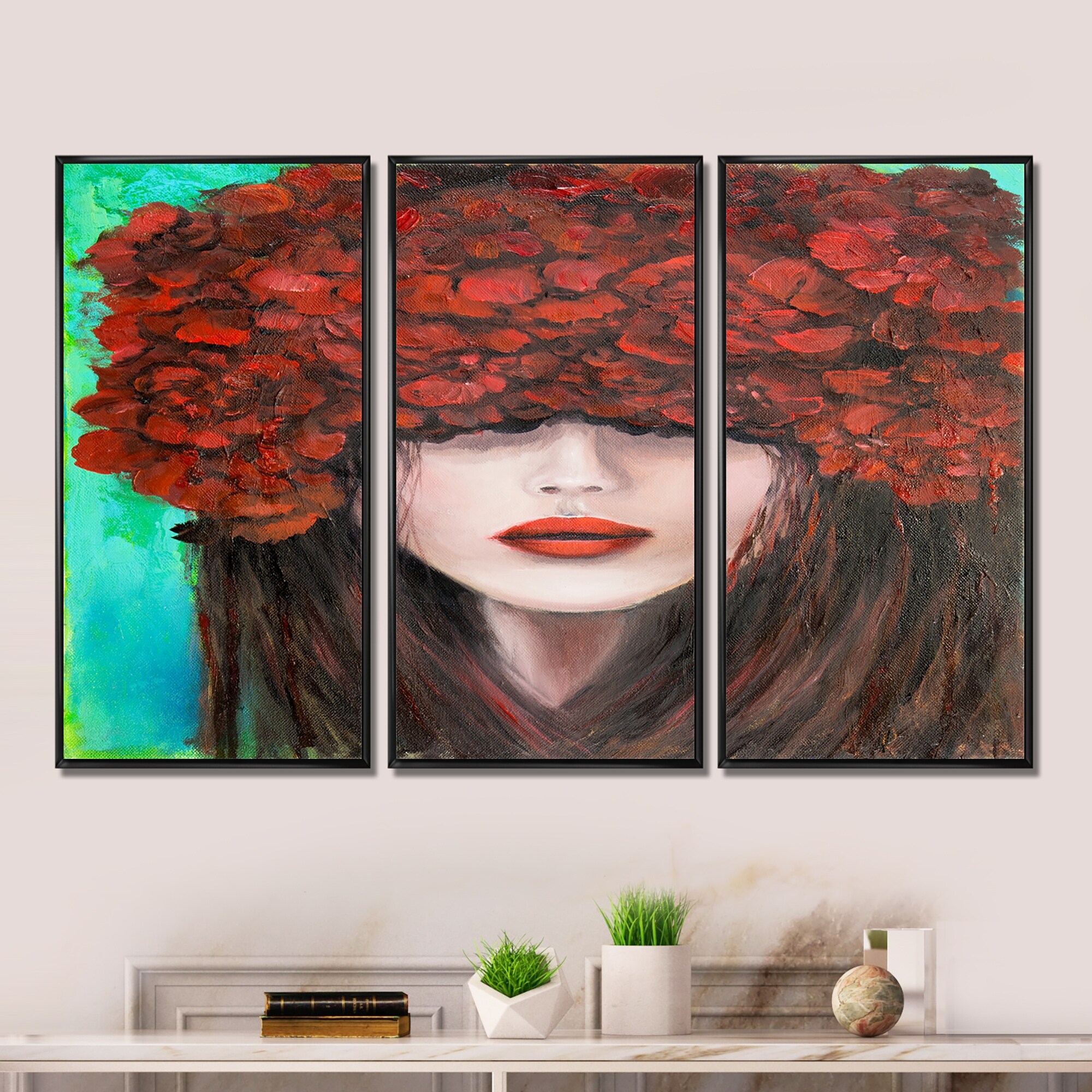 Designart "Portrait Of a Young Woman With Red Flowers" Modern Framed Art Set of 3 - 4 Colors of Frames