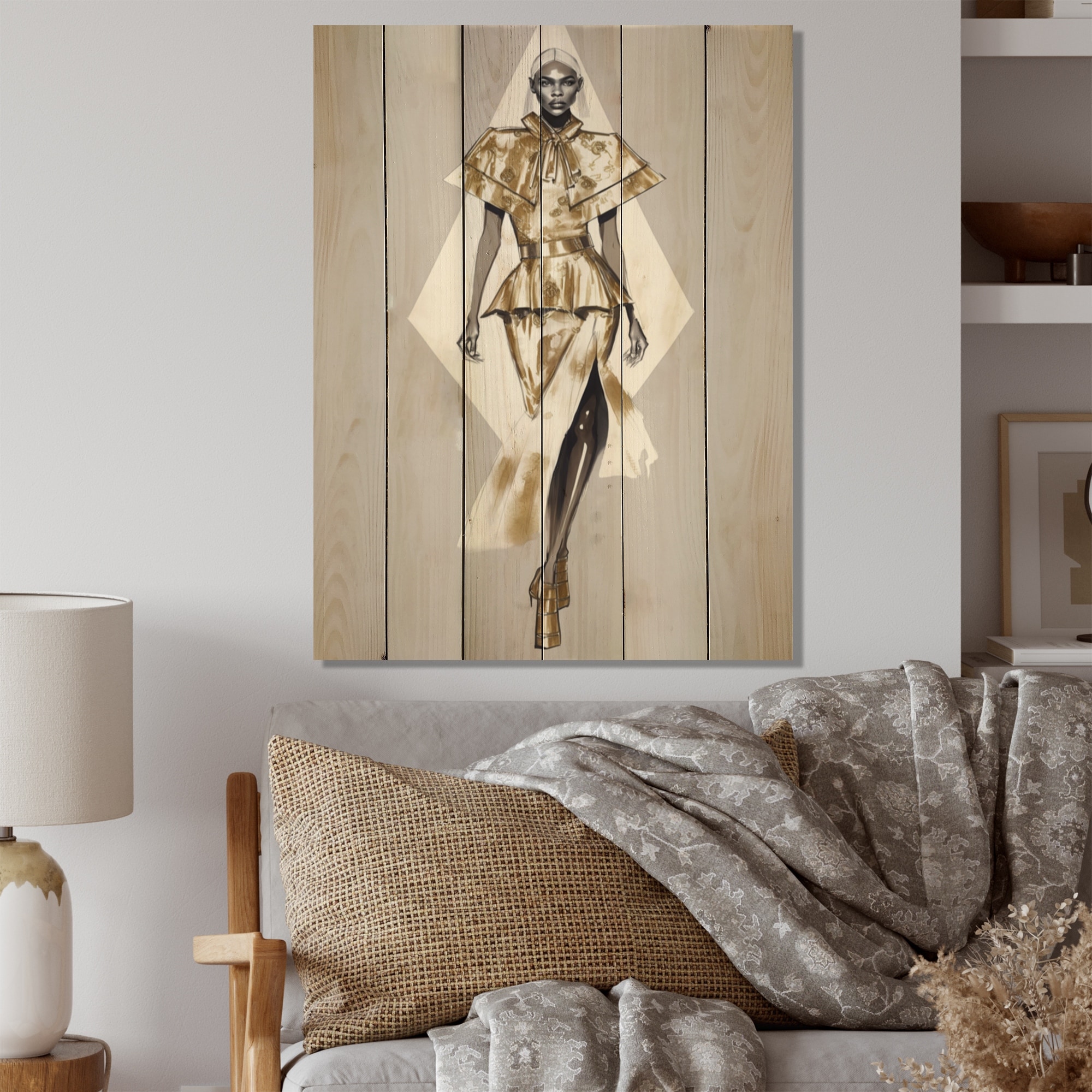 Designart "Catwalk Model Couture in Tones of Gold I" Fashion Woman Print on Natural Pine Wood
