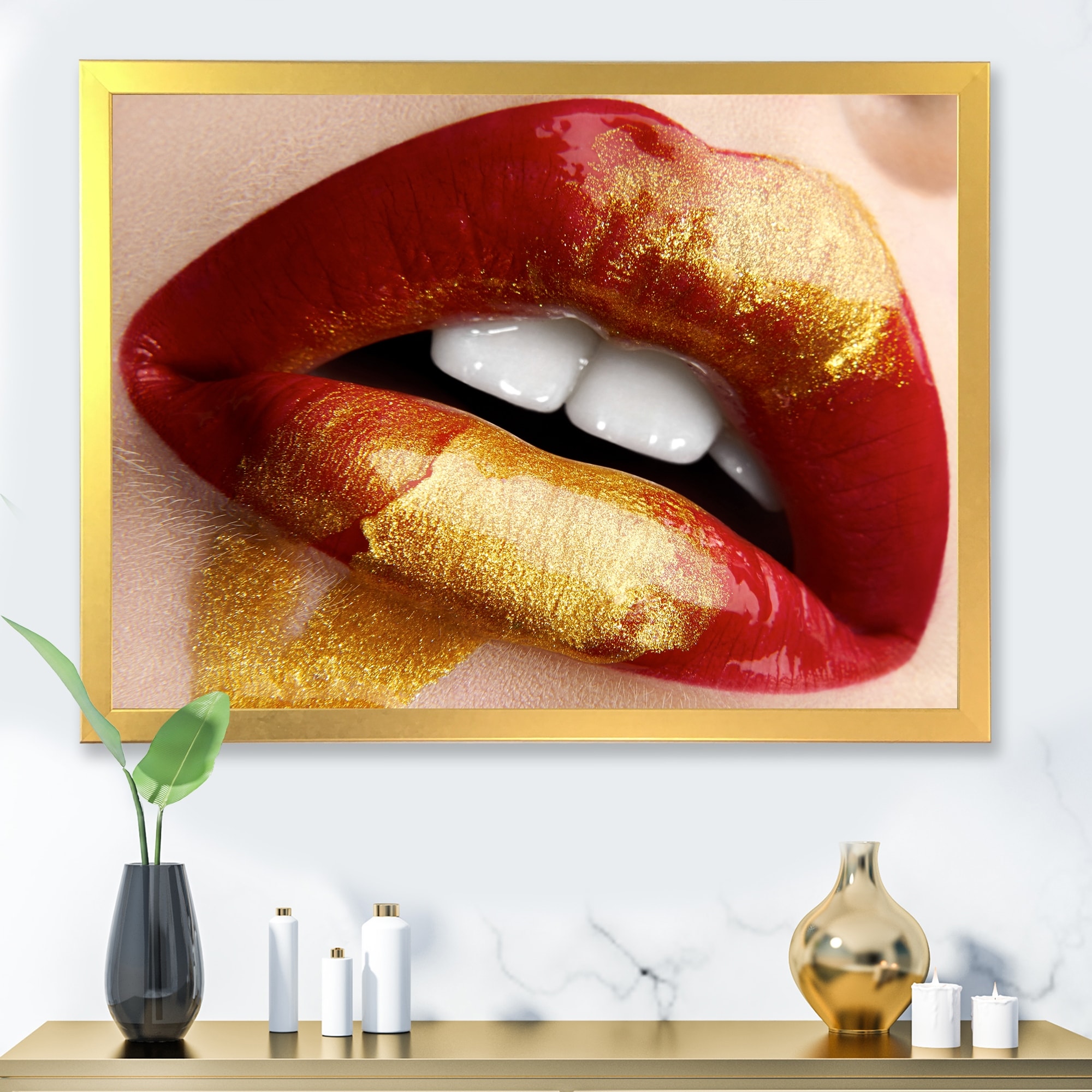 Designart "Plump Woman Lips With Red and Gold" Modern Framed Art Print