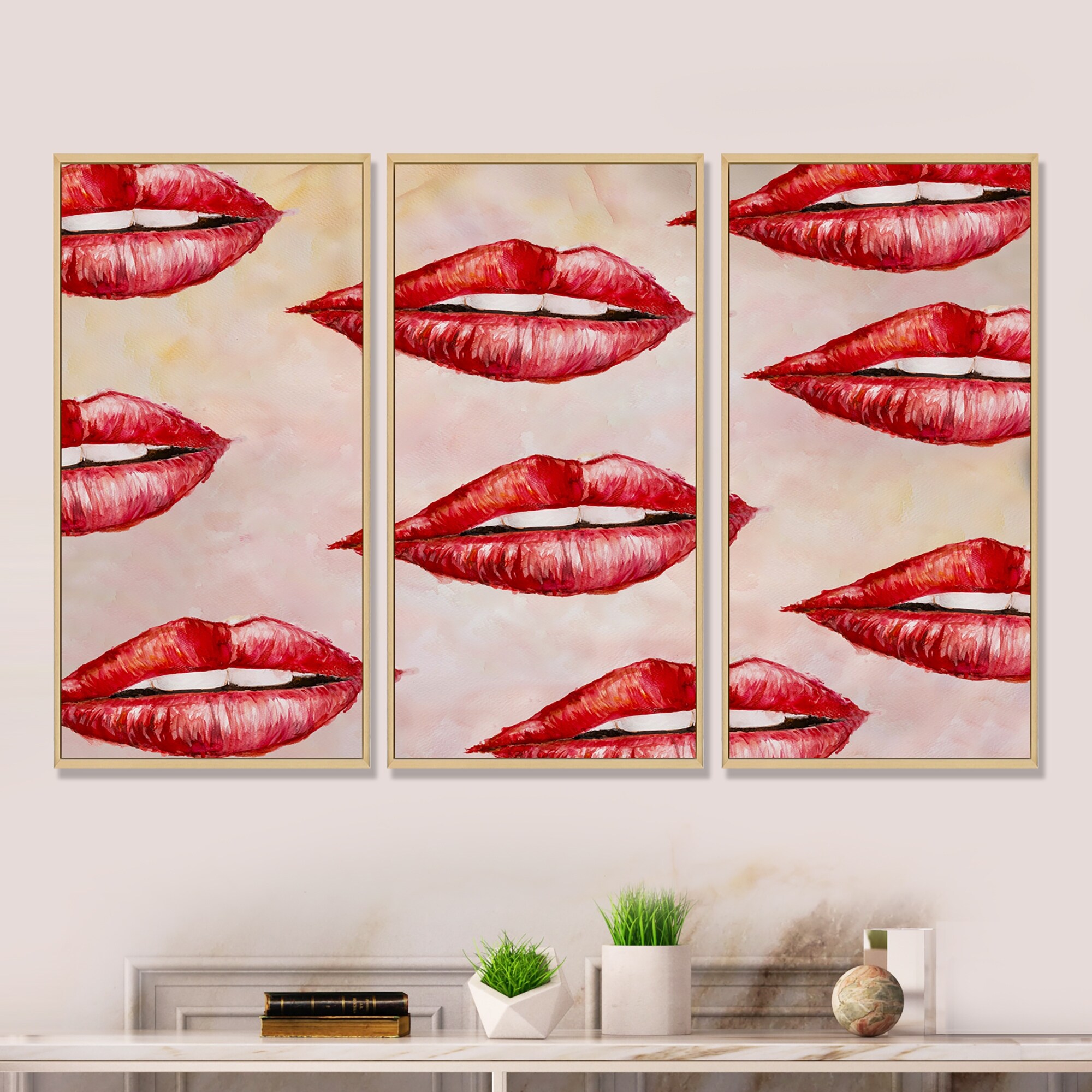 Designart "Red Woman Lips Pattern" Modern Framed Wall Decor Set of 3 - 4 Colors of Frames