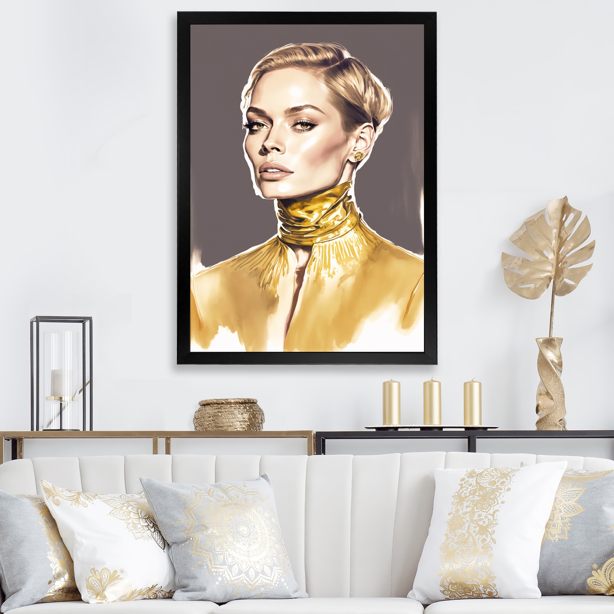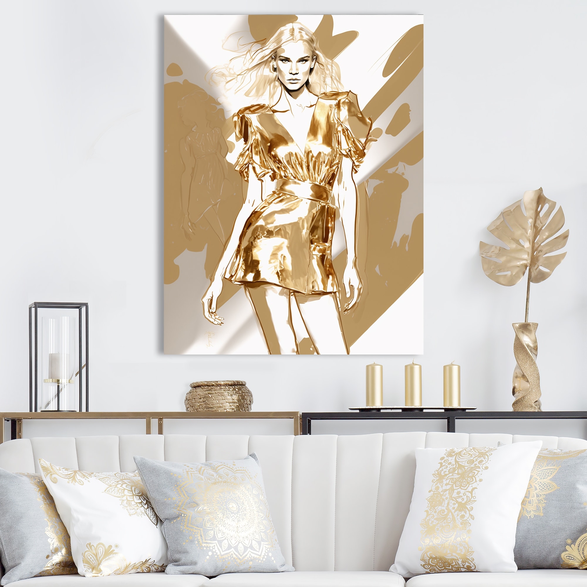 Designart "Catwalk Model Couture in Tones of Gold IV" Fashion Woman Framed Canvas Print