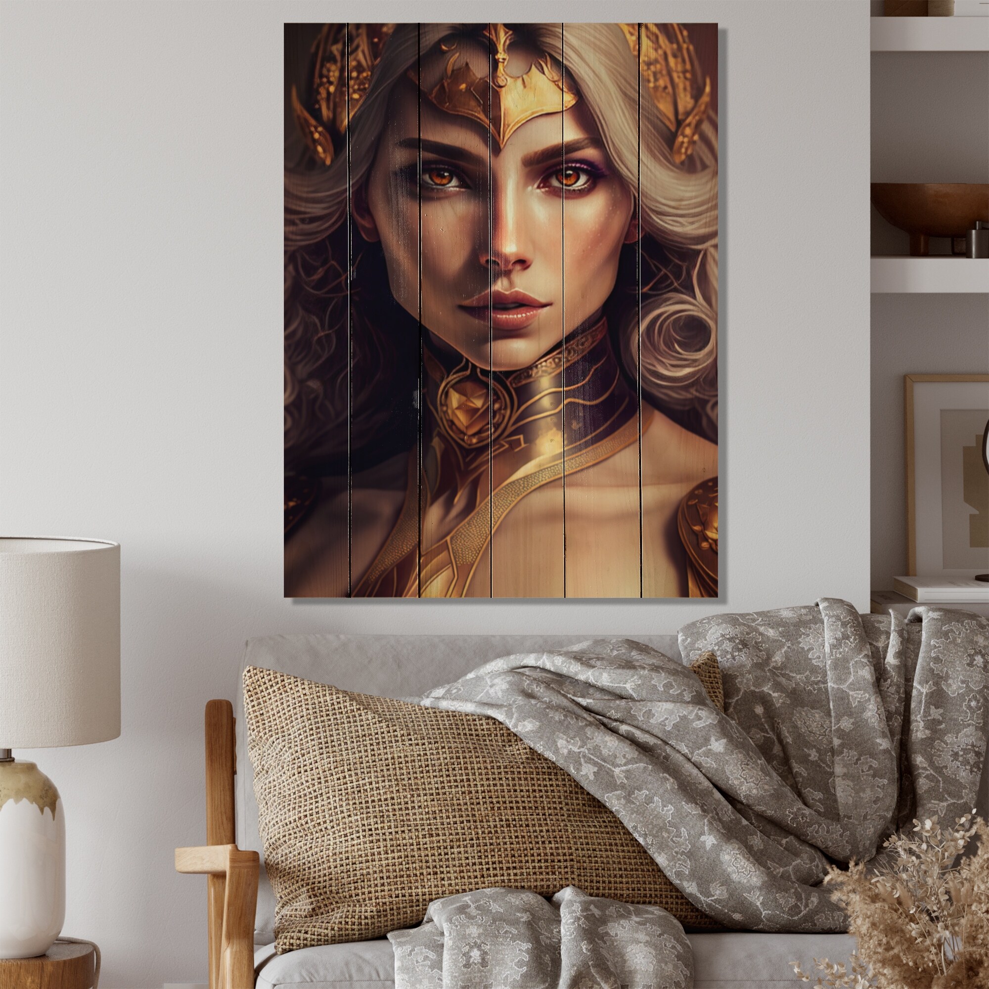 Designart "Goddess With Golden Crown II" Woman Goddess Print on Natural Pine Wood