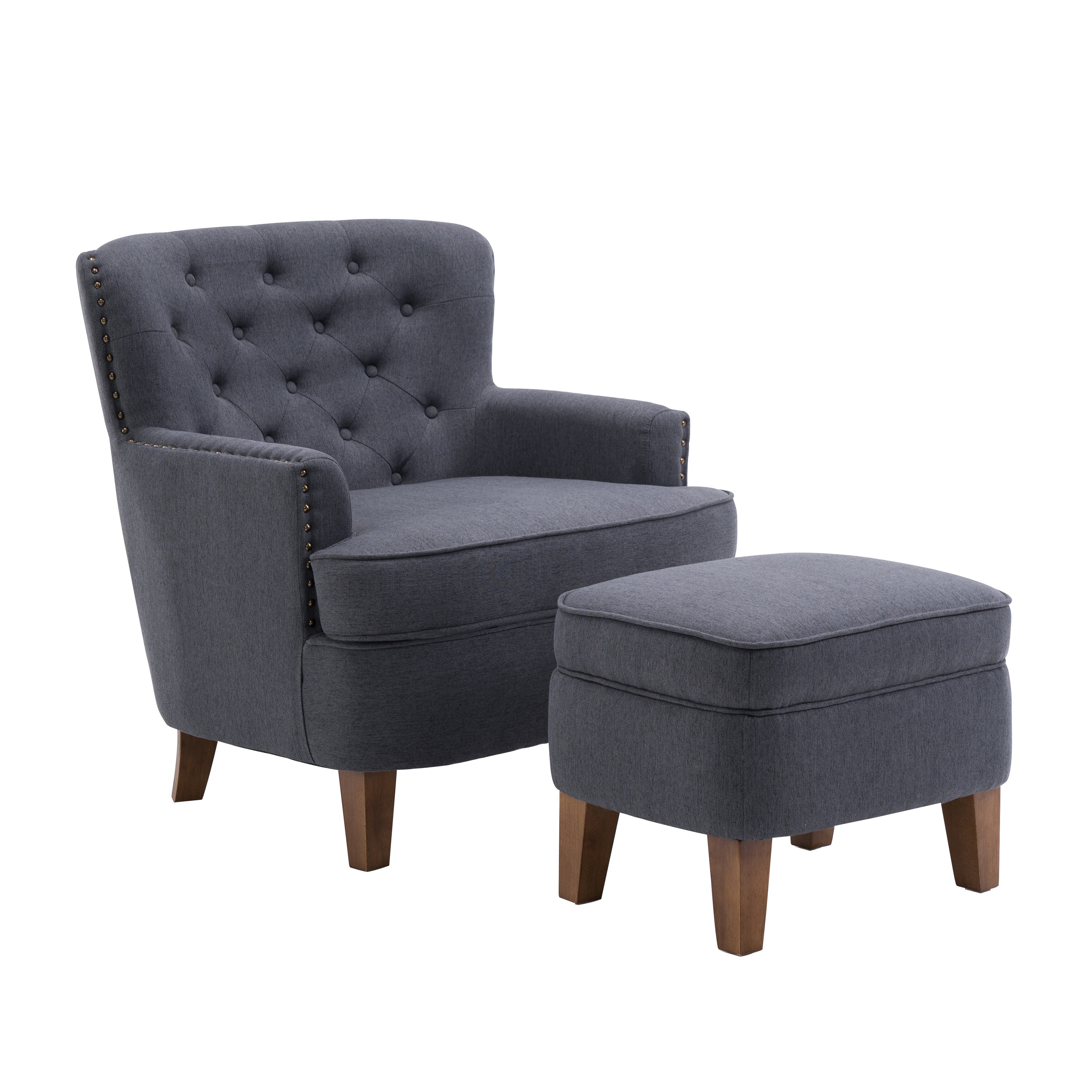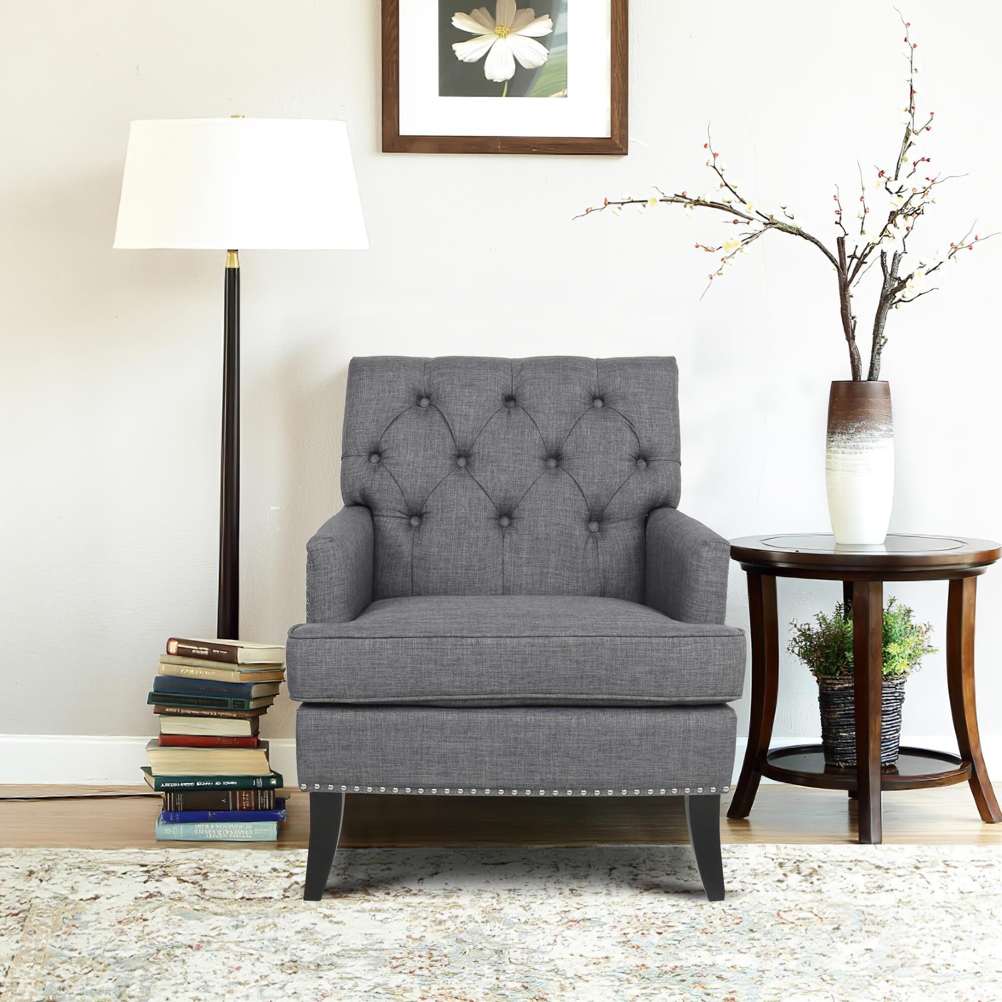 Modern Armchair Living Room Linen Fabric Padded Seat Accent Chair Removable Cushion Seat with Nailheads and Solid Wood Legs