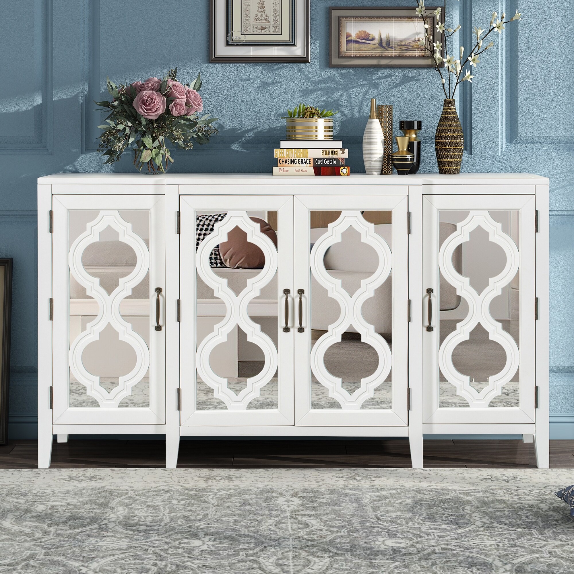 Modern Mirrored Console Table Sideboard with 4 Cabinets and 3 Adjustable Shelves and Manufactured Wood Console Table