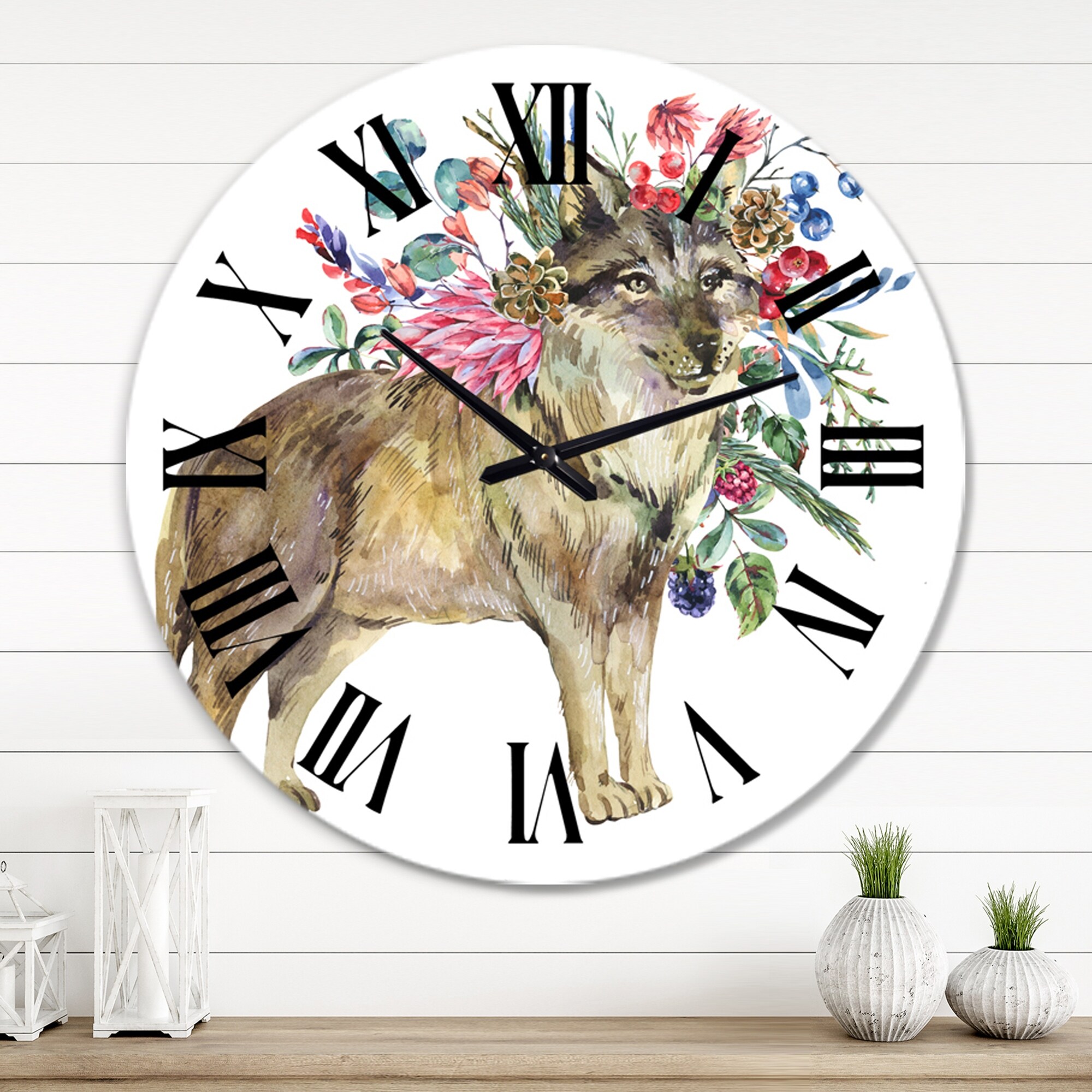 Designart 'Wolf With Woodland Flowers' Farmhouse wall clock
